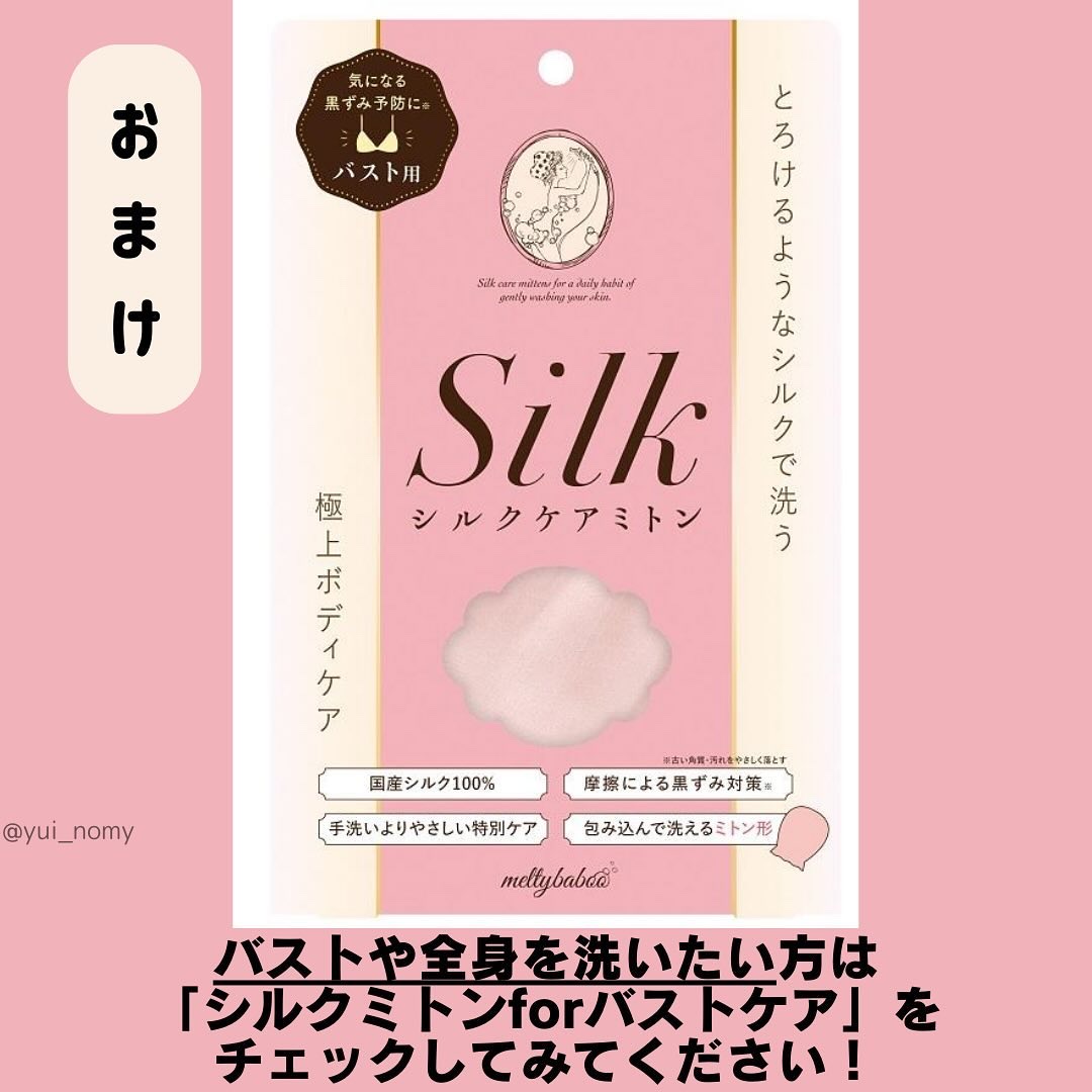 - とろけるようなシルクで洗う。シルクとパイルの2WAYミトン。パイルでなめらかな泡を作り、シルクでやさしく撫で洗う。デリケートゾーンにおける、ごしごし洗いでの摩擦を軽減し、日々の汚れや古い角質による黒ずみをやさしい使い心地でケア。