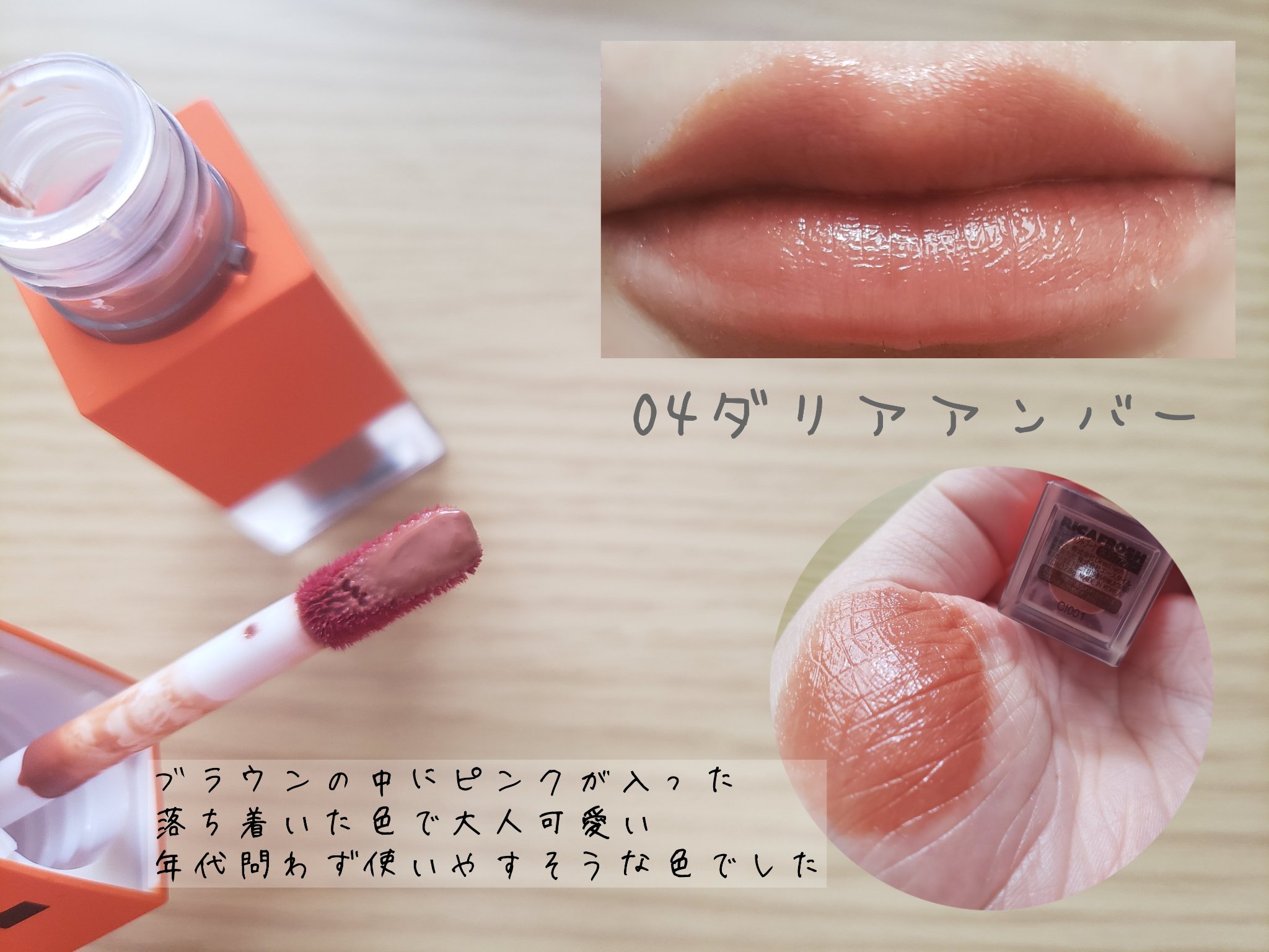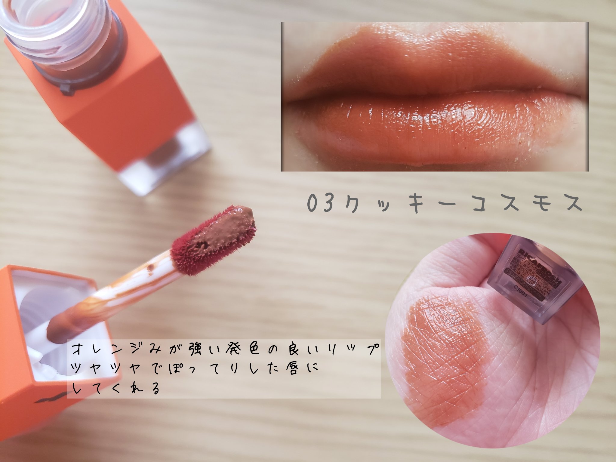 オイルと水分の最適な割合がうるおいとツヤ感をキープ。ヒアルロン酸、タルトチェリー、イノシトールなど保護する成分でコンディションを整えてふっくらなめらかな唇へ😙 発色が良く、ぷるんとツヤツヤな唇になれます。ティッシュオフした後もしっかりと色が残るので色持ちも良いです。 今回試した”03 クッキーコスモス”はムード漂うちょっぴりビターなヴィンテージブリックブラウン。オレンジ感のあるブラウンなので普段ブラウン系を使わない私でも使いやすかったです😍