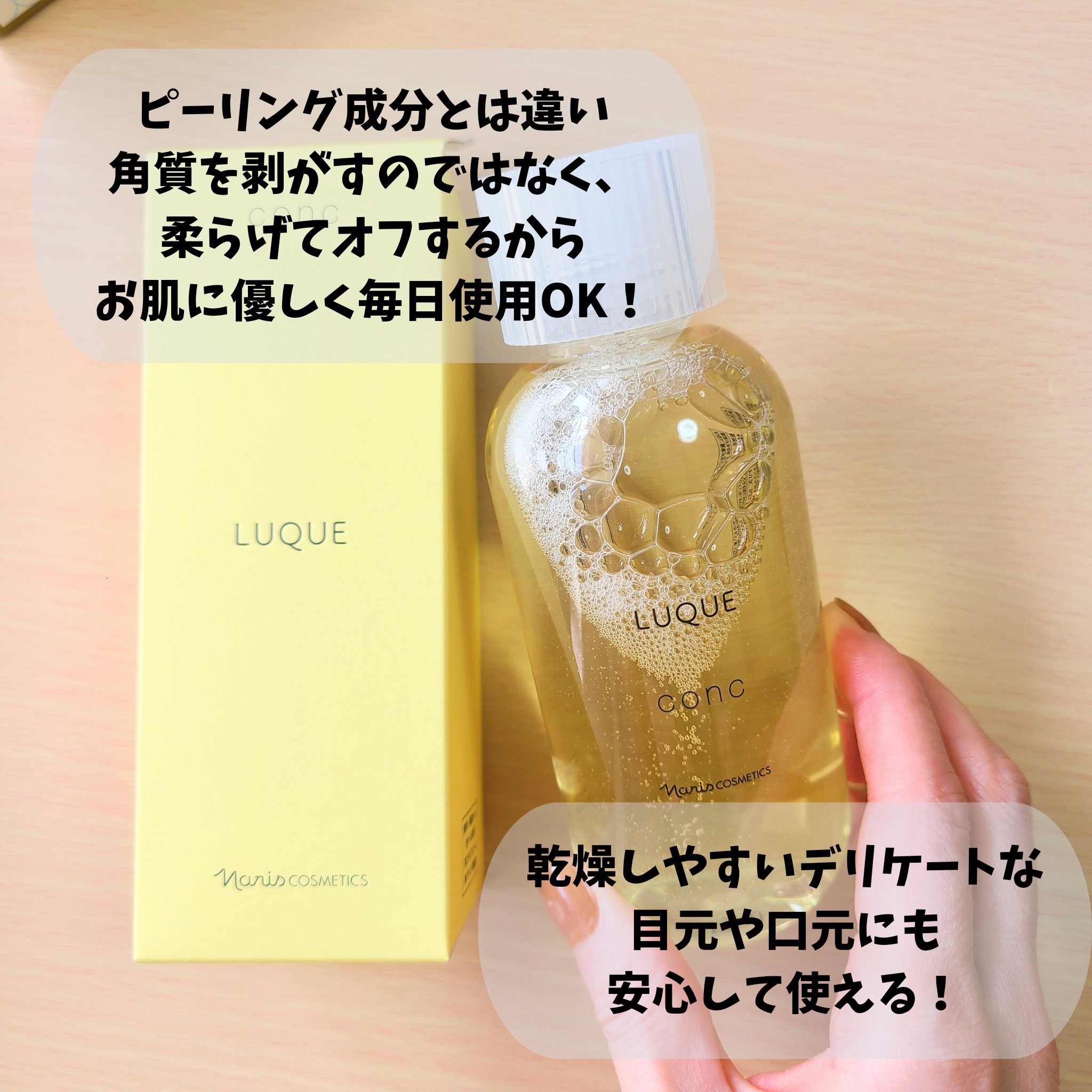 - ■毛穴、ザラつき、くすみ※1が気になる方に、不要な角質をふきとって、つるんとなめからかな肌へ。 ナリスのふきとり化粧水は、5年連続国内売上シェアNO.1※2 肌にとって余分な老化角質をおだやかに取り除き、素肌が持つ本来の美しさを引き出すルクエのコンク(ふきとり用化粧水)はナリスの80年以上続く研究開発によって誕生しました。 ●キレイのこたえは、ふきとり化粧水という選択。 植物保湿成分で古い角質をやさしくオフして、次に使うスキンケアアイテムのなじみをサポート。日々変化する肌をすこやかに整えます。毎日の“ふきとり習慣”で理想の肌に近づきましょう。 ●厳選した3つの植物の力で角層ケアをサポート。 ・柔らかくほぐして、取り除きやすくする「ヨクイニンエキス」※3 ・潤いを与え、健康的な角層へ導く「月見草エキス」※4 ・潤いを逃さず閉じ込める「白花豆エキス」※5 【使用方法】 1. 朝晩2回、洗顔後の後に。 2. コットンに8〜10滴程度(500円玉大)を含ませます。目安は、コットン裏側に染み込む程度。 3. できるだけ力を入れずに、やさしくなでるように顔全体を拭き取ります。 ※1古い角質による ※2ナリス化粧品 2015~2019年度 「ふきとり用化粧水」販売動向調査 TPCマーケティングリサーチ株式会社調べ※3 ハトムギ種子エキス(保湿成分) ※4 メマツヨイグサ種子エキス(保湿成分) ※5ベニバナインゲン種子エキス(保湿成分)