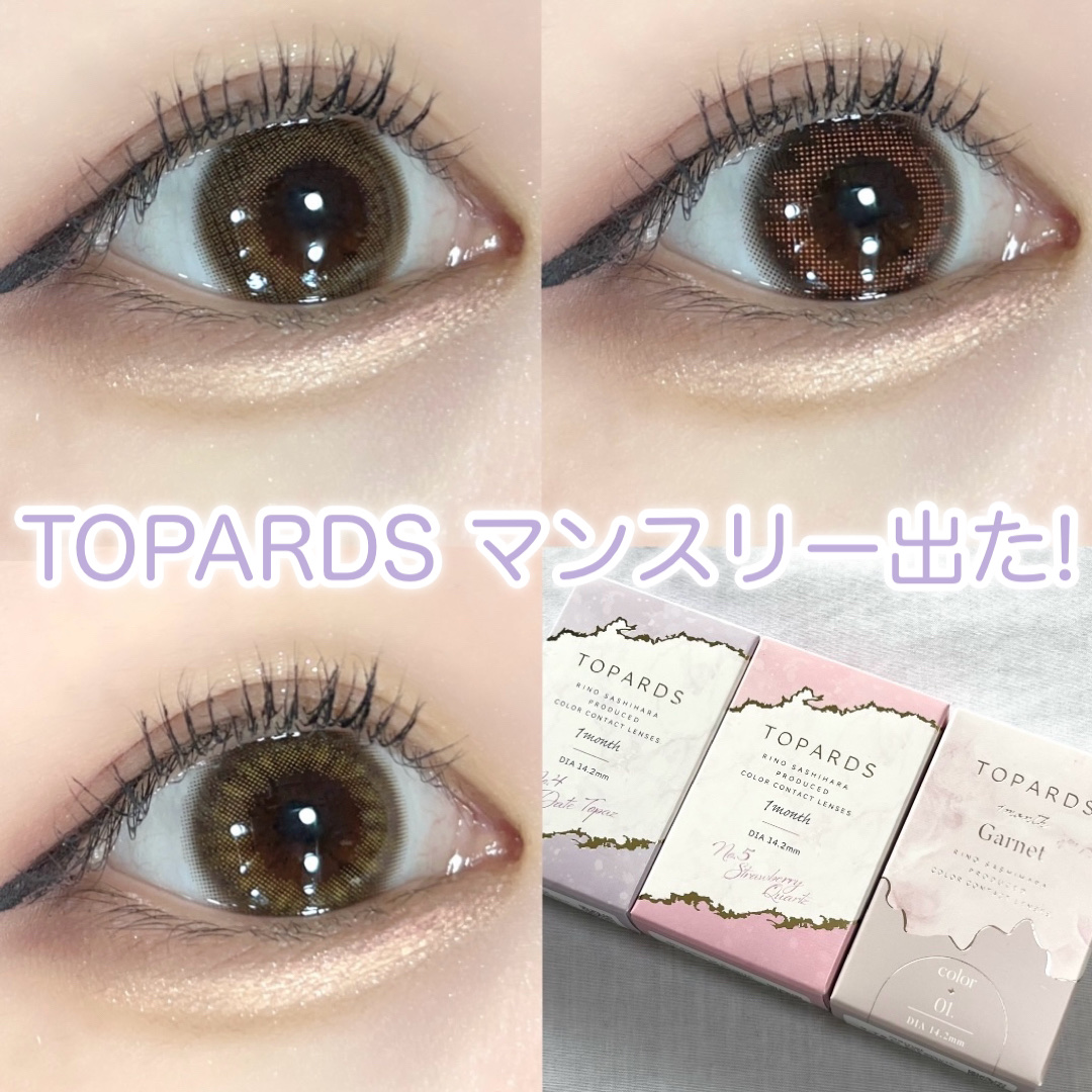 - ※2025年6月以降、商品パッケージ裏面・側面の一部表記を順次変更いたします。尚、これにかかる商品の交換・返品は承っておりません。 『TOPARDS(トパーズ)』は、透明感とうるおいのある瞳にこだわって開発されたカラーコンタクトレンズブランドです。 うるうる・キラキラした瞳に映り、どんなシーンにも馴染んでくれる商品となっております。 Date Topaz(デートトパーズ) DIA:14.2mm/着色直径13.4mm 着けてるとバレにくくこっそり可愛いが仕込めるふんわりデザイン。 Strawberry Quartz(ストロベリークォーツ) DIA:14.2mm/着色直径13.5mm ブラウンカラーにピンクをほんのりプラス。 着けることで一気に甘い顔にみせるレンズ。 Garnet(ガーネット) DIA:14.2mm/着色直径13.5mm ハイライトカラーが、ヘルシーな血色感と輝きをプラス。 洒落感ライトブラウン。 Cream Rose(クリームローズ) DIA14.2mm/着色直径13.4mm まろやかピンクが上品かわいいちゅるんローズブラウン。 Mocha Ring(モカリング) /DIA14.5mm/着色直径13.7mm くりっとフチで甘さたっぷりの瞳♡愛されモカブラウン。 Jelly Quartz(ゼリークォーツ) /DIA14.2mm/着色直径13.6mm ぼかし細フチでぷるんと輝く瞳に、毎日使いたくなる引き算大人盛れレンズ。 カラーコンタクトレンズの不適正使用による眼障害の危険性等などがあります。 ●コンタクトレンズは高度管理医療機器です。不十分な洗浄・消毒など不適切なケアや、長時間・交換期間を超えた装用により、アレルギー性結膜炎、角膜感染症、角膜潰瘍等の重篤な眼障害が発生する危険性があります ●ご使用前に取扱説明書を確認してください 使用上の留意事項 ●眼科医院等を受診してからお求めください ●眼に異常を感じたら直ちにレンズ使用を中止し、お近くの眼科等で診察を受けてください ●医師の指示にしたがってご使用ください ●コンタクトレンズを装用する場合、自覚症状がなくても、眼科医院等での定期検査を受けてください ●レンズに不具合がある場合は使用しないでください