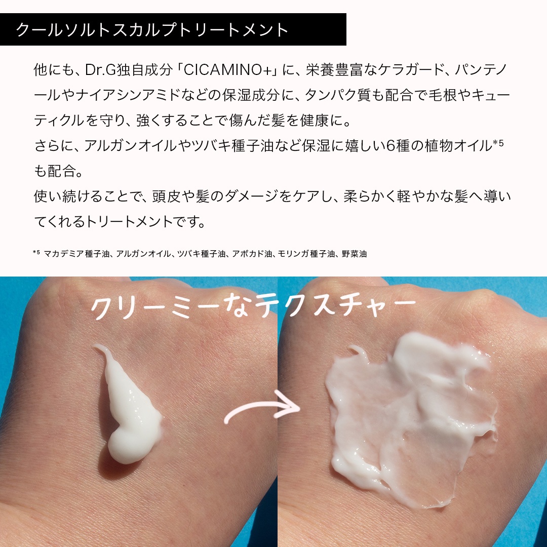 - ヘアケアラインは、頭皮も肌だ!ということで開発されました。 全商品に、クールソルト*が含まれており、頭皮を健やかに保ちます。 クールソルトは、3年の研究期間を経て、フランスの下ランド産の天然塩を液体状にし、ミネラル成分を最大限に活かせるように開発された、Dr.G独自の整肌成分です。敏感な肌を整え、頭皮をすっきりさせます。 シャンプー:パンテノール*やナイアシンアミド*が含まれており、ハリ・コシケアを助け、タンパク質*とアミノ酸*でキューティクルをケアします。さらに、3種のシカ成分*が頭皮を健やかに保ちます。 トリートメント:タンパク質*やアミノ酸*、ケラガード*で毛髪やキューティクルを守り、傷んだ髪を補修します。 ノンシリコンで、頭皮にも使え、頭皮をパックすることができます。 *整肌成分