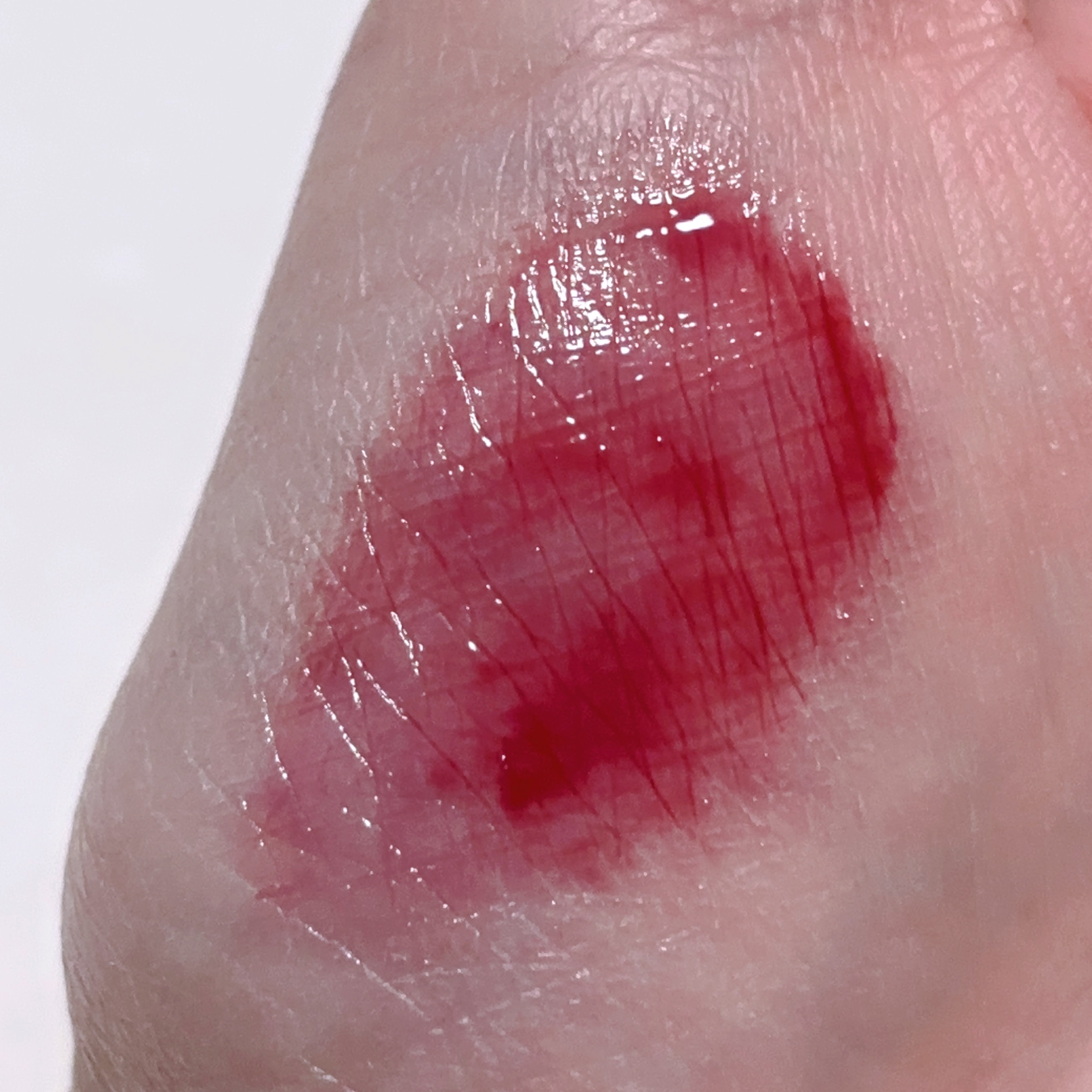 唇にのせるとキラキラはしますが、色味はないですが…個人的に単品でつけると 血色の悪い唇になってしまうので 手持ちのリップにプラスした方が、可愛いと思います💗 肌馴染みがよく、使いやすい色です☺️ ピンクがかった赤でゴールドラメがキラキラと美しいです💖 発色もよく使いやすい色だと思います☺️ ラメが光の角度できらめいて、また違う印象に見え美しいです❤️ テクスチャーは軽めで、アプリケーターも小ぶりで塗りやいです! 香りはレッドベリー・フローラル・バニラ・ムスクの甘い香りがしますが、甘い香りが苦手な私でも、キツくなく心地よく使用できました☺️