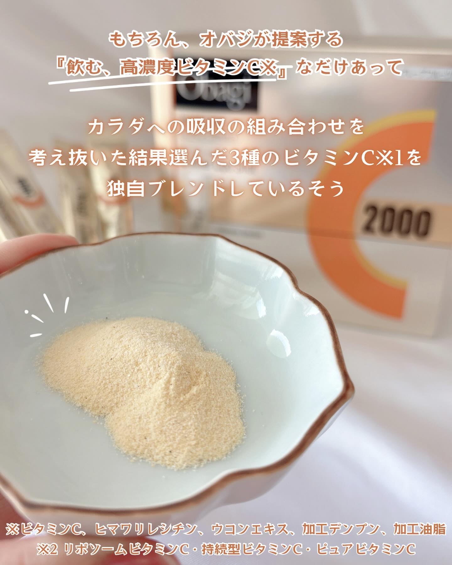 - オバジが提案する飲む“ビタミンC”。オリジナルのリポショットC*を配合し、すばやく届けることを目指し開発した顆粒タイプ。内側からハリとうるおいのある毎日を応援し、透き通るような美しさをサポートします。 <オバジ独自の研究により内側にアプローチ> 1. オバジ独自のリポショットC*。ビタミンCを1日(目安量)当たり2000mg配合。 2. 美容サポート成分のコラーゲンペプチド、コラプラス®に加え、ツボクサエキス、ヒハツエキス配合。 3. 毎日続けていただくために、水なしでもお召し上がりいただけるよう味やくちどけにこだわりました。 ・グレープフルーツ風味 ・顆粒タイプ ・ノンカフェイン *ビタミンC、ヒマワリレシチン、ウコンエキス、加工デンプン、加工油脂