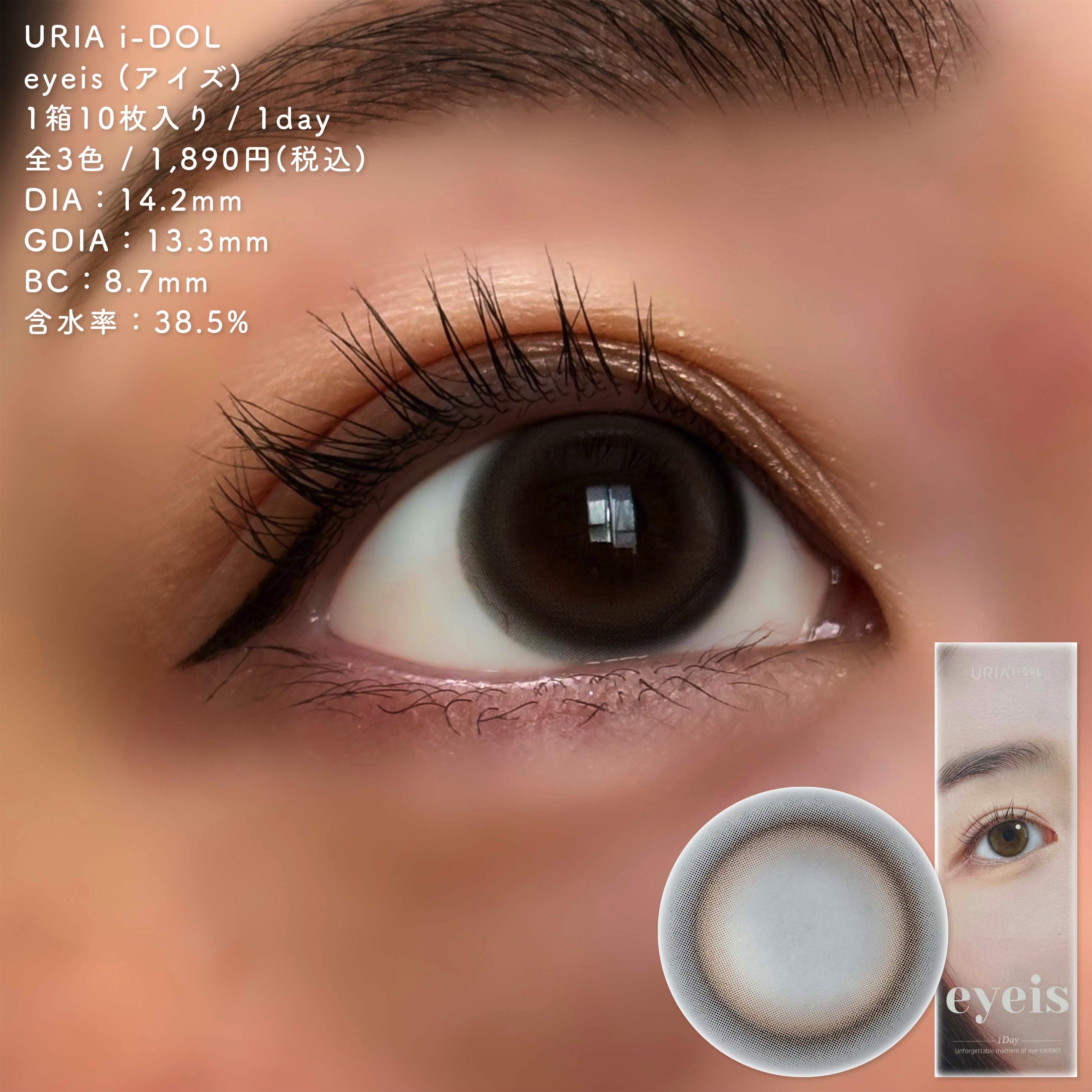- ※2025年 12月24日〜ブランド名変更(URIA i-DOL→URIAへ)に伴い、2026年3月頃より商品パッケージの仕様を順次変更いたします。尚これにかかる商品の返品・交換は承っておりません。 【eyeis(アイズ)】小さな光を宿す、美しい瞳。 極小ドットの繊細なデザインのアイズシリーズ。誰でも自然なトーンアップが叶う、なめらかで美しい瞳が誕生。 ◆ASH BROWN(アッシュブラウン)|モダンな雰囲気のアッシュブラウン ほどよいツヤ感で誰もを魅了させる。 ブラックとアッシュカラーの調和で瞳が誕生。 ◆ESSENTIAL GRAY(エッセンシャルグレー)|惹きつけられるような魅惑グレー きつすぎない印象の柔らかい光のグレー。濡れツヤ感のあるカラーで自然な光を。 ◆MELO BROWN(メロブラウン)|潤みを帯びたナチュラルブラウン 水分をたくさん含んだようなピュアな瞳。柔らかいライトブラウンの光で自然な潤いを。 カラーコンタクトレンズの不適正使用による眼障害の危険性等などがあります。 ●コンタクトレンズは高度管理医療機器です。不十分な洗浄・消毒など不適切なケアや、長時間・交換期間を超えた装用により、アレルギー性結膜炎、角膜感染症、角膜潰瘍等の重篤な眼障害が発生する危険性があります ●ご使用前に取扱説明書を確認してください 使用上の留意事項 ●眼科医院等を受診してからお求めください ●眼に異常を感じたら直ちにレンズ使用を中止し、お近くの眼科等で診察を受けてください ●医師の指示にしたがってご使用ください ●コンタクトレンズを装用する場合、自覚症状がなくても、眼科医院等での定期検査を受けてください ●レンズに不具合がある場合は使用しないでください
