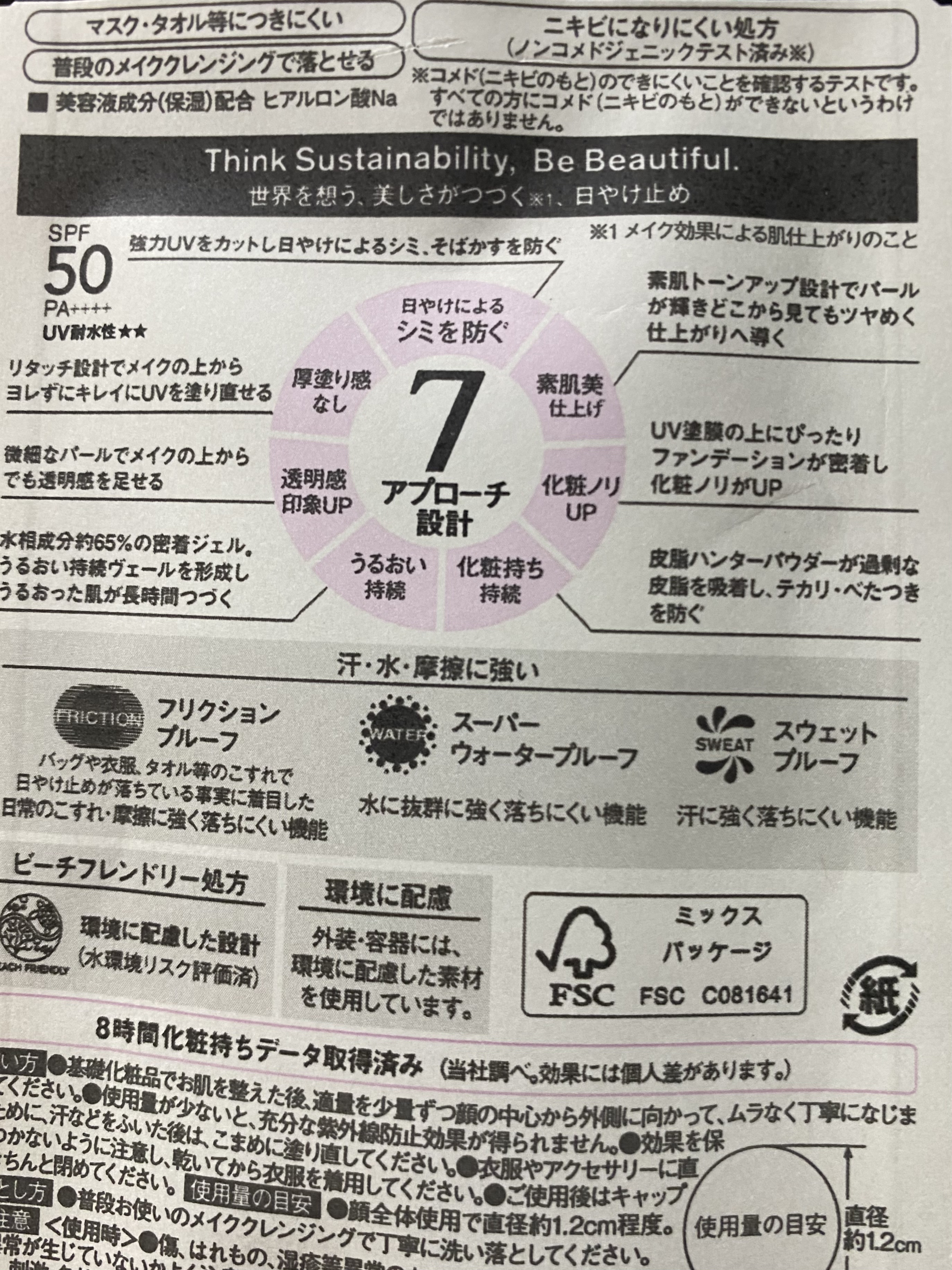 - 顔用日やけ止めジェル UV下地が7つの機能でアプローチ 朝塗りたての顔印象つづく。美耐久プライマーUV ●7アプローチ設計 【日やけによるシミを防ぐ】強力UVをカットし日やけによるシミ・ソバカスを防ぐ。 SPF50・PA++++・UV耐水性★★ 【素肌美仕上げ】素肌トーンアップ設計でパールが輝きどこから見てもツヤめく仕上がりへ導く 【化粧ノリUP】UV塗膜の上にぴったりファンデーションが密着し化粧ノリがUP 【化粧持ち持続】皮脂ハンターパウダーが過剰な皮脂を吸着し、テカリ・べたつきを防ぐ 【うるおい持続】水相成分約65%の密着ジェル。うるおい持続ヴェールを形成し、うるおった肌が長時間つづく 【透明感UP】微細なパールでメイクの上からでも透明感を足せる 【厚塗り感なし】リタッチ設計でメイクの上からヨレずにキレイにUVを塗り直せる ●マスク・タオル等につきにくい ●ニキビになりにくい処方(ノンコメドジェニックテスト済*2) *2 コメド(ニキビのもと)のできにくいことを確認するテストです。すべての方にコメド(ニキビのもと)ができないというわけではありません。 ●普段のメイククレンジングで落とせる ●美容液成分(保湿)配合 ヒアルロン酸Na ●汗・水・摩擦に強い 【フリクションプルーフ】日常のこすれ・摩擦に強く落ちにくい機能 【スーパーウォータープルーフ】水に抜群に強く落ちにくい機能 【スウェットプルーフ】汗に強く落ちにくい機能 ●ビーチフレンドリー処方 環境に配慮した設計(水環境リスク評価済み) ●環境に配慮 外装・容器には環境に配慮した素材を使用しています。FSC認証 ●8時間化粧持ちデータ取得済み(当社調べ。効果には個人差があります)