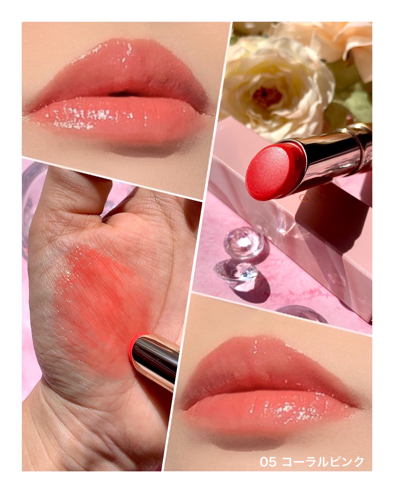多幸感あふれるクリアなコーラル🩷 特に時間が経つと蛍光感がでてきちゃう。 THEピンクのリップを求めている人にピッタリ! ティッシュオフしても若干色は残ってる! おすすめの塗り方は、いつもよりも少し濃いめに塗ってから、ティッシュオフ!