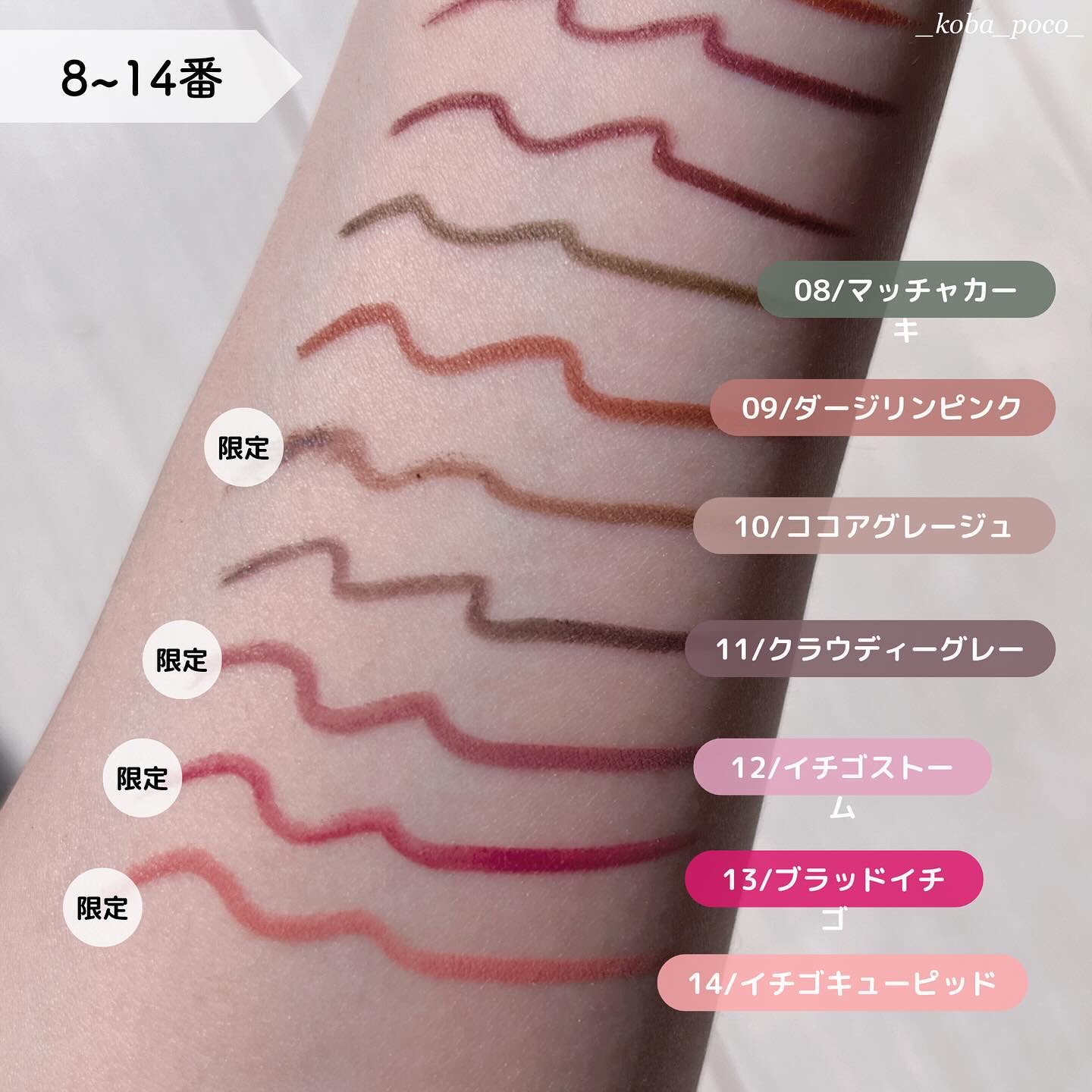 09 ダージリンピンク ピンクと名前が付いているけど スウォッチの印象は明るめオレンジブラウン。 11 クラウディーグレー 今回の5色の中だと1番濃いめのカラー。 12 イチゴストーム(限定) 他ではあまり見ない絶妙カラーで ラベンダーベージュといったイメージ。 14 イチゴキューピッド(限定) これぞ粘膜色!というような ピンクベージュ。 15 カプチーノピンク 期待を裏切らなかった可愛すぎる新色… 一言で言うなら白みピンクブラウン。
