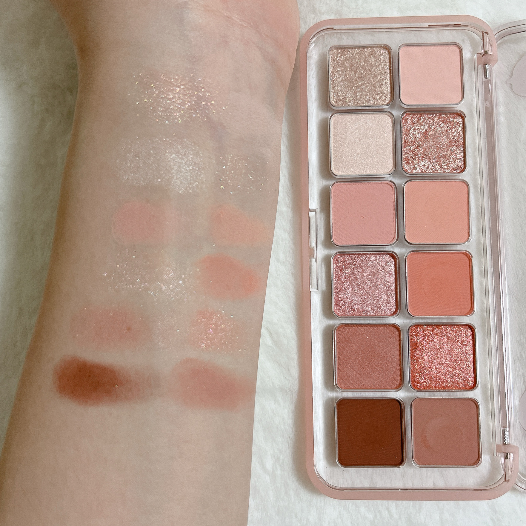 イエベ春大優勝カラーですが 黄みというよりピンク感が強いので イエベのピンクメイクにぴったりだと思います👌🏻 プロアイパレットエアーは 12色もあるところも凄いですし 特に好きなのは多色パレットでありがちな 派手派手デカラメが無いところです笑 どれも使いやすいちらちら輝くタイプのラメなので 本当に捨て色なしです🙆♀️ 少しでも参考になったら嬉しいです😌