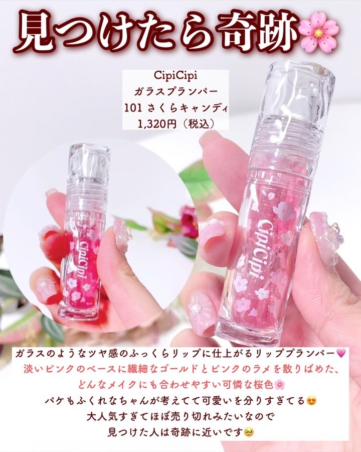 最近の新作コスメの中で1番楽しみに待ってた CipiCipiの限定色プランパー💛 ゴールドラメが驚くほどたっぷりぎっしり✨️ ほんのり黄色に発色するからティントの上から重ねてニュアンスチェンジにもなる! はちみつの香りらしいけど、そんなに強くないから、はちみつ苦手な私でも使えた!!