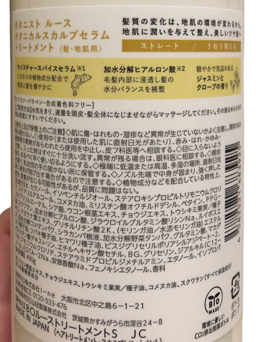 - <ルース ボタニカルスカルプセラム シャンプー(ストレート)> 水、ココイルメチルタウリンNa、グリセリン、ラウラミドプロピルベタイン、ラウロイルメチルアラニンNa、コカミドプロピルベタイン、ココアンホ酢酸Na、ウコン根茎エキス、チョウジエキス、トウシキミ果実/種子油、コメヌカ油、スクワラン、加水分解ヒアルロン酸、ジラウロイルグルタミン酸リシンNa、ルイボスエキス、マヨラナ葉エキス、グリチルリチン酸2K、シラカンバ樹液、加水分解野菜タンパク、ポリクオタニウム-10、ココイル加水分解コラーゲンK、デシルグルコシド、セテアレス-60ミリスチルグリコール、コカミドMEA、DPG、BG、リンゴ酸、塩化Na、エタノール、メントール、EDTA-2Na、安息香酸Na、フェノキシエタノール、香料 <ルース ボタニカルスカルプセラム トリートメント(ストレート)> 水、セタノール、イソペンチルジオール、ステアロキシプロピルトリモニウムクロリド、ステアリルアルコール、コメヌカ油、ミリスチン酸オクチルドデシル、ベタイン、PPG-3カプリリルエーテル、シア脂、ウコン根茎エキス、チョウジエキス、トウシキミ果実/種子油、スクワラン、加水分解ヒアルロン酸、ジラウロイルグルタミン酸リシンNa、ルイボスエキス、マヨラナ葉エキス、グリチルリチン酸2K、(モリンガ油/水添モリンガ油)エステルズ、加水分解コメタンパク、シラカンバ樹液、加水分解野菜タンパク、グルタミン酸、マカデミア種子油、ツバキ種子油、ヒマワリ種子油、ビスジグリセリルポリアシルアジペート-2、パルミチン酸デキストリン、エチルヘキサン酸セチル、BG、グリセリン、ジアルキル(C12-18)ジモニウムクロリド、ステアラミドプロピルジメチルアミン、エタノール、イソプロパノール、EDTA-2Na、安息香酸Na、フェノキシエタノール、香料