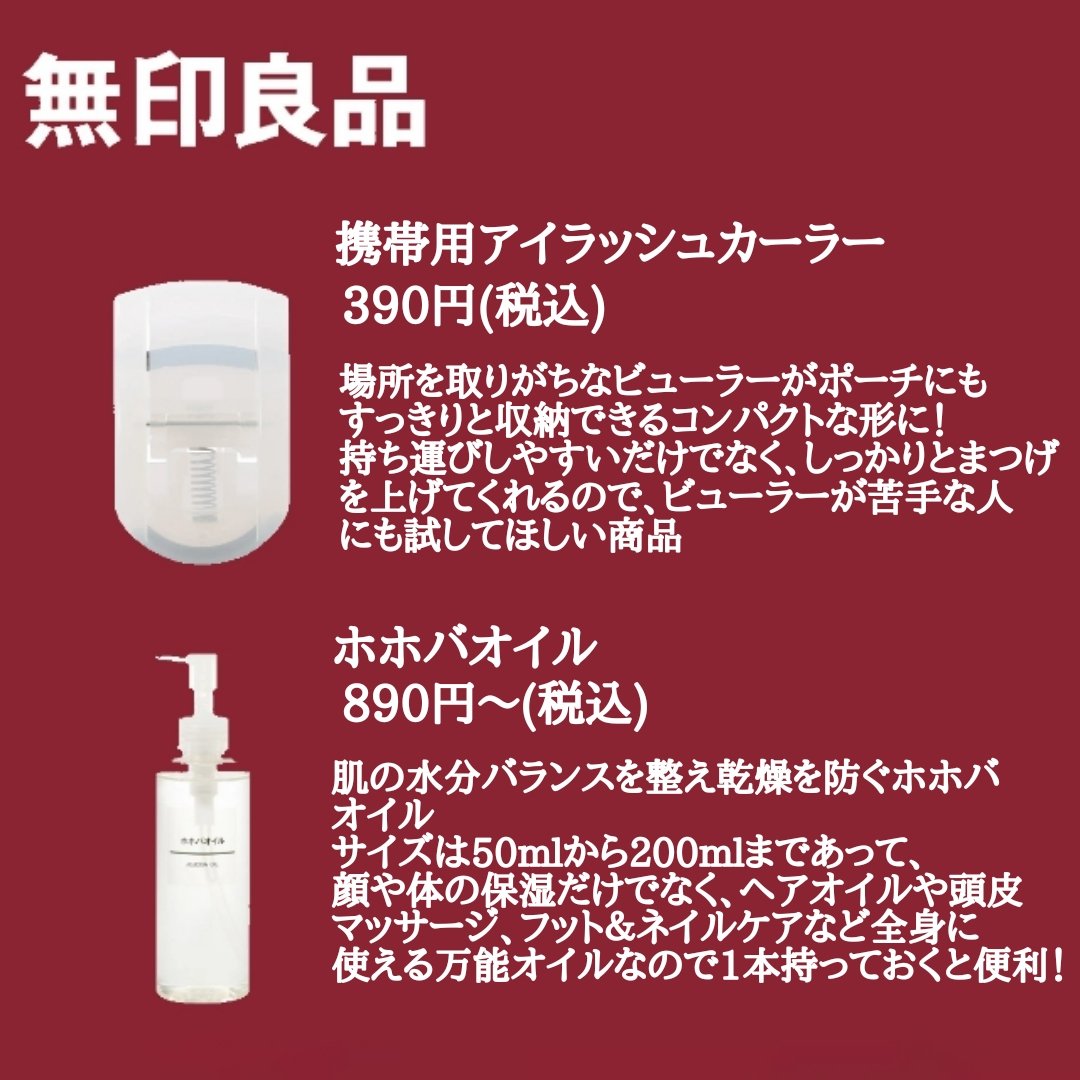 無印良品 購入品☺️✨💫ホホバオイル 50ml¥890→何度もリピート。ヘアオイルに◎💫アイカラー4色タイプ 03スモーキーピンク ¥890→初めて購入。ブルベ寄り過ぎないので使いやすそうかなと。タール系色素も入ってない◎💫携帯用アイラッシュ...