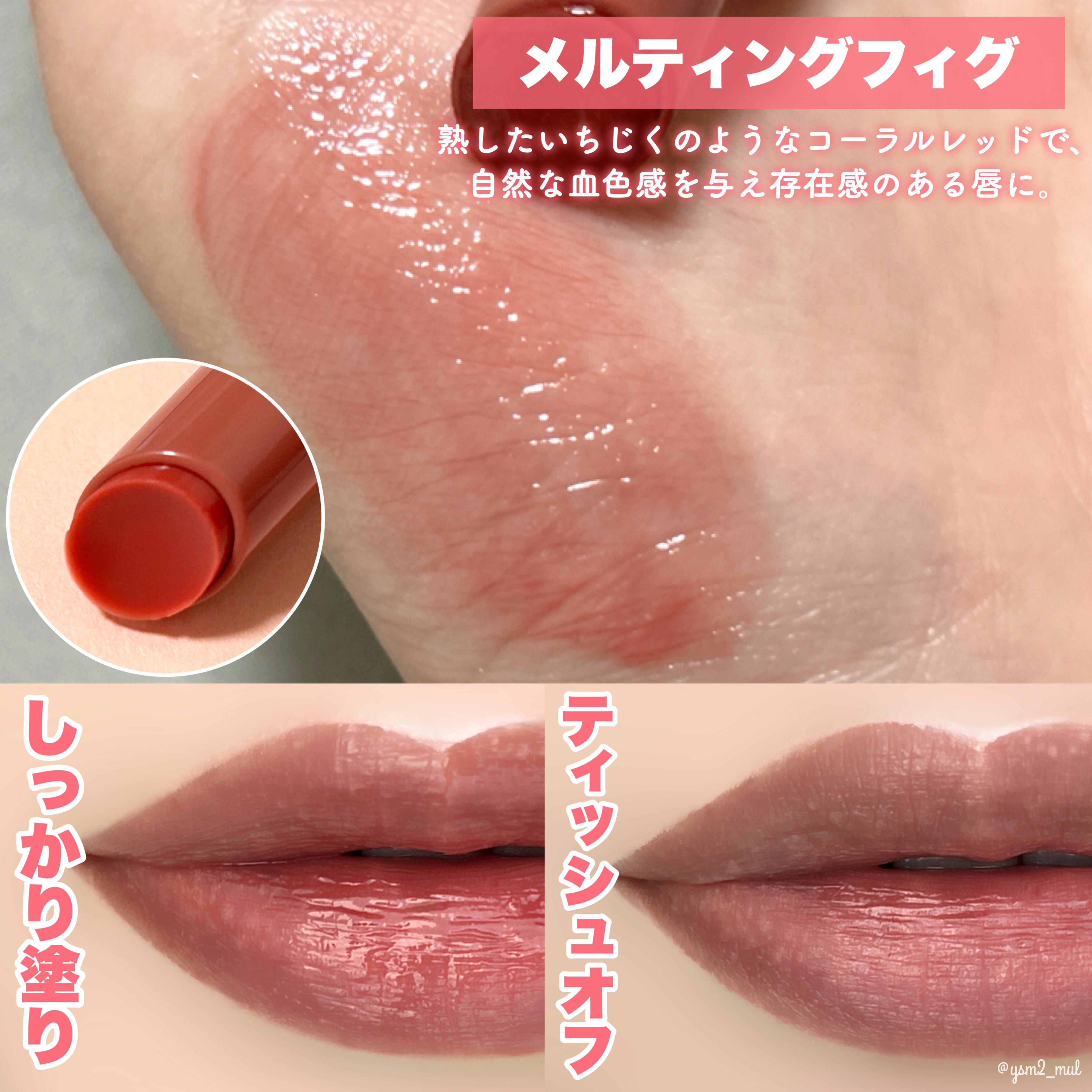 - <01 メルティンググレープ> リンゴ酸ジイソステアリル、ダイマージリノール酸ダイマージリノレイルビス(ベヘニル/イソステアリル/フィトステリル)、ビスジグリセリルポリアシルアジペート-2、トリイソステアリン酸ポリグリセリル-2、合成ワックス、水添ポリイソブテン、テトライソステアリン酸ペンタエリスリチル、セチルPEG/PPG-10/1ジメチコン、1,2-ヘキサンジオール、イソステアリン酸ソルビタン、酸化チタン、ジステアルジモニウムヘクトライト、酸化鉄、赤202、(エチレン/プロピレン)コポリマー、炭酸プロピレン、青1、香料、リモネン、黄5、リナロール、黄4、水、テトラ(ジ-t-ブチルヒドロキシヒドロケイヒ酸)ペンタエリスリチル、BG、モモ果実エキス、ビルベリー果実エキス、ウンシュウミカン果皮エキス、フェノキシエタノール、エチルヘキシルグリセリン <02 メルティングフィグ> リンゴ酸ジイソステアリル、ダイマージリノール酸ダイマージリノレイルビス(ベヘニル/イソステアリル/フィトステリル)、ビスジグリセリルポリアシルアジペート-2、トリイソステアリン酸ポリグリセリル-2、合成ワックス、水添ポリイソブテン、テトライソステアリン酸ペンタエリスリチル、セチルPEG/PPG-10/1ジメチコン、1,2-ヘキサンジオール、イソステアリン酸ソルビタン、ジステアルジモニウムヘクトライト、酸化チタン、黄5、赤202、(エチレン/プロピレン)コポリマー、炭酸プロピレン、酸化鉄、香料、リモネン、リナロール、黄4、水、テトラ(ジ-t-ブチルヒドロキシヒドロケイヒ酸)ペンタエリスリチル、BG、モモ果実エキス、ビルベリー果実エキス、ウンシュウミカン果皮エキス、フェノキシエタノール、エチルヘキシルグリセリン