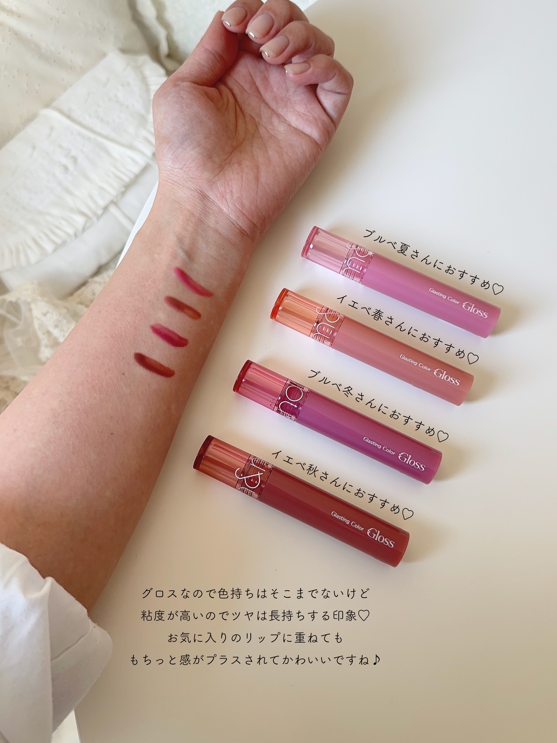 とっても塗り心地が良くてお気に入りになったので おすすめの5色をご紹介します ♡ 軽い付け心地が好きな方、 ぷるんとしたみずみずしい唇に仕上げたい方におすすめ ♡ パケも可愛くてテンションが上がりますよね🧊♡