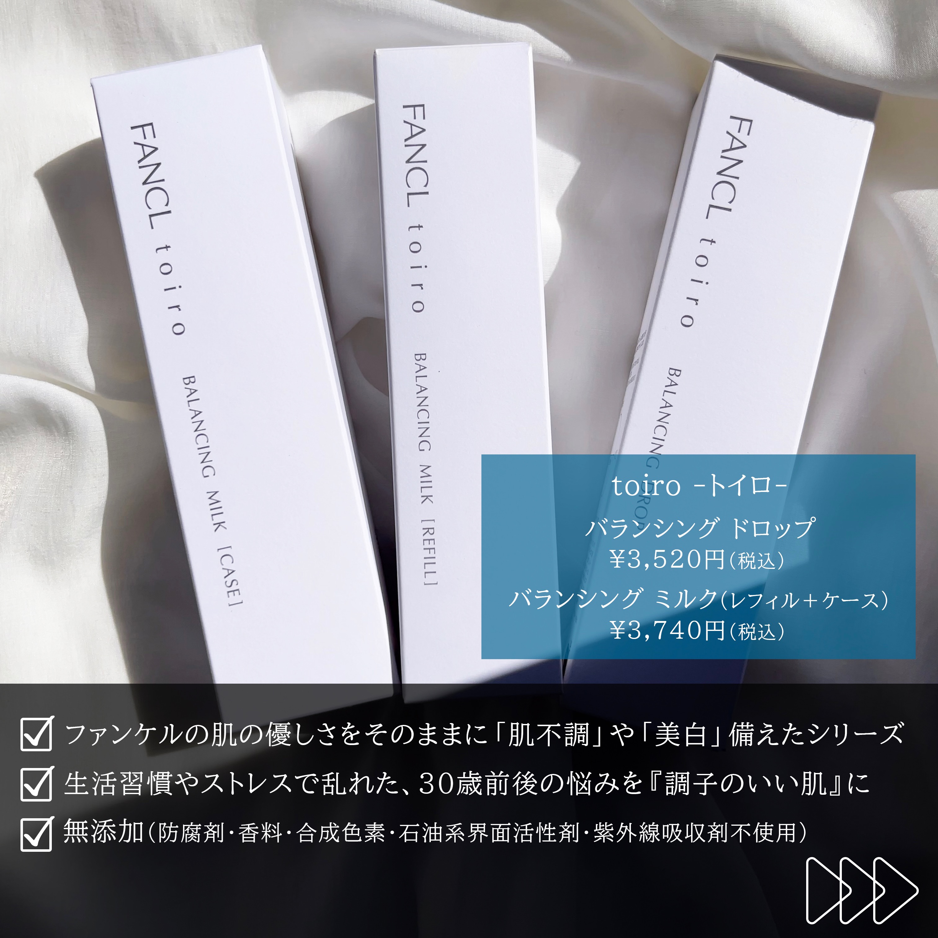 FANCL無添加トイロうるおい・美白・肌あれ予防2週間キットバランシングドロップ(化粧水)バランシングミルク(乳液)toiroの2週間キットを購入してみました!その中から化粧水と乳液をレビューします❣️🤍トイロバランシングドロップ(化粧水)🤍...