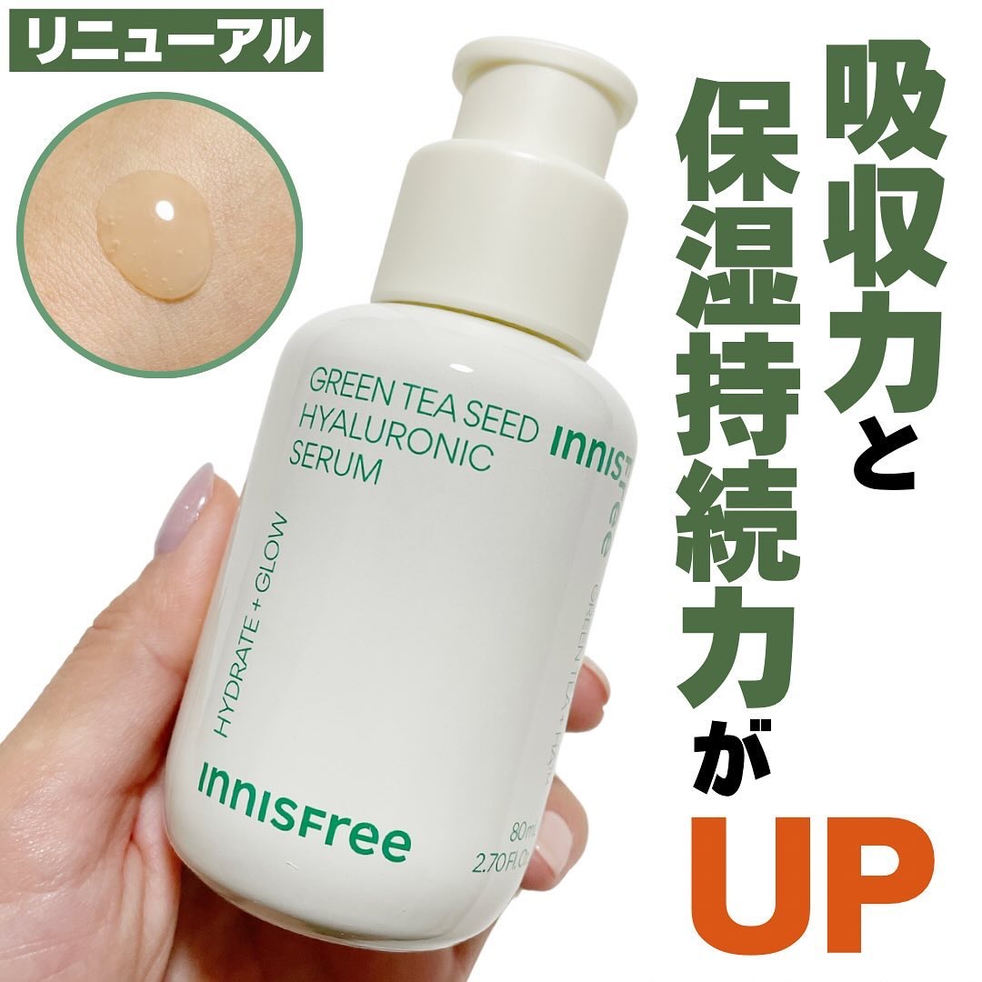 - ※「グリーンティーシード セラム N」のリニューアル品です。 潤いを素早く与え、 乾燥ダメージにゆらぎにくい肌に導く導入美容液 1. イニスフリーNo.1*1美容液のリニューアル!ナノカプセルヒアルロン酸*2採用。 従来品のヒアルロン酸をナノカプセル化し、より素早く*3潤いを角質層のすみずみまでお届けできます。 2. どの肌悩みにも幅広くアプローチ パワーアップ*3したウォーターチャージ処方でインナードライ肌はもちろん、肌の油分・水分のバランスを整えるので脂性肌や混合肌の方にもおすすめします。 3. こだわりの低刺激処方*4 ノンコメドジェニックテスト*5 ・アレルギーテスト*6済み *1 韓国イニスフリー美容液カテゴリー販売金額(2021年売上) *2 ヒアルロン酸Na、ヒアルロン酸、ヒアルロン酸クロスポリマーNa、加水分解ヒアルロン酸、アセチルヒアルロン酸Na *3 従来品と比較 *4 低刺激テスト済み/自社調べ *5 すべての方にコメド(ニキビのもと) ができないというわけではありません。*6 すべての方にアレルギー反応が起こらないというわけではありません。