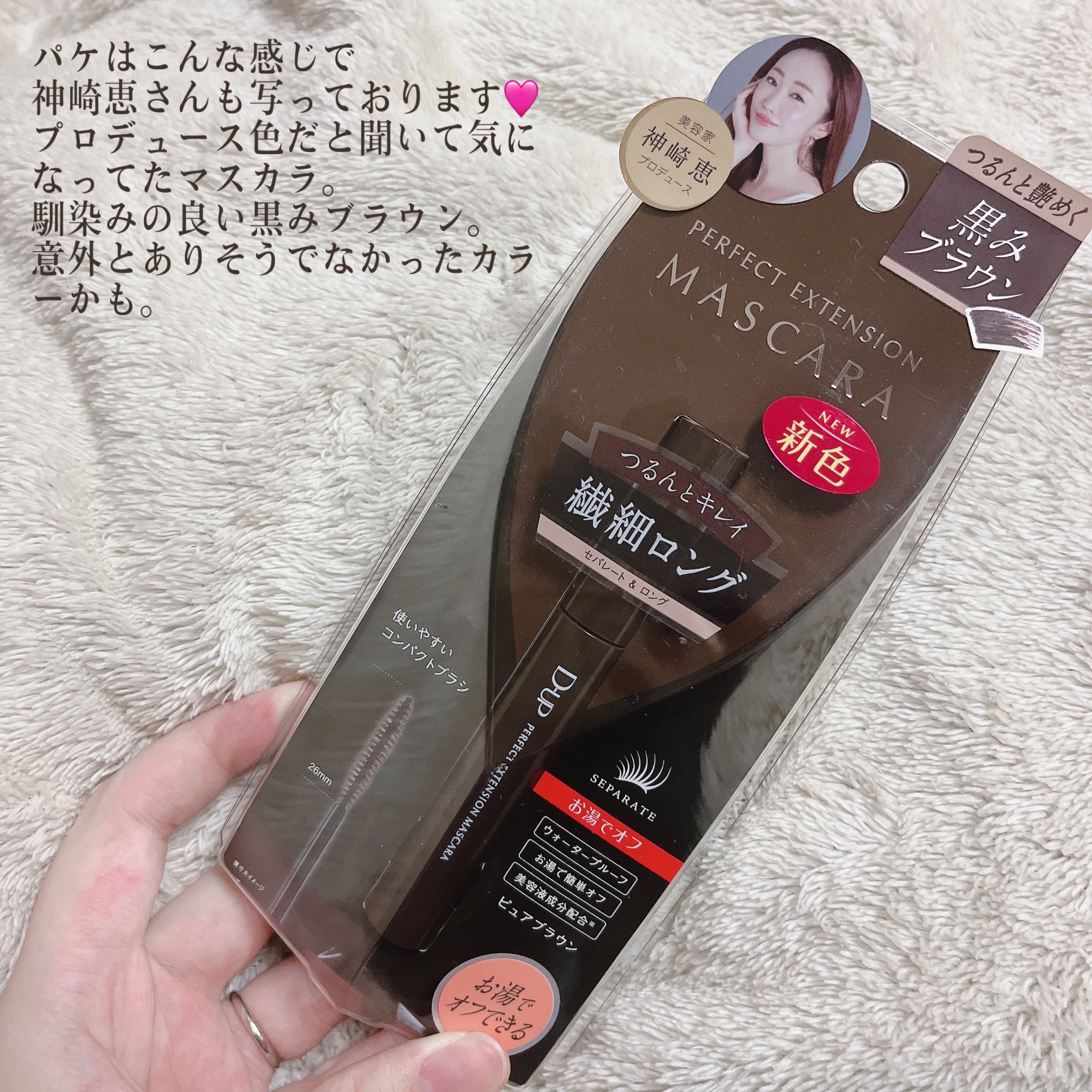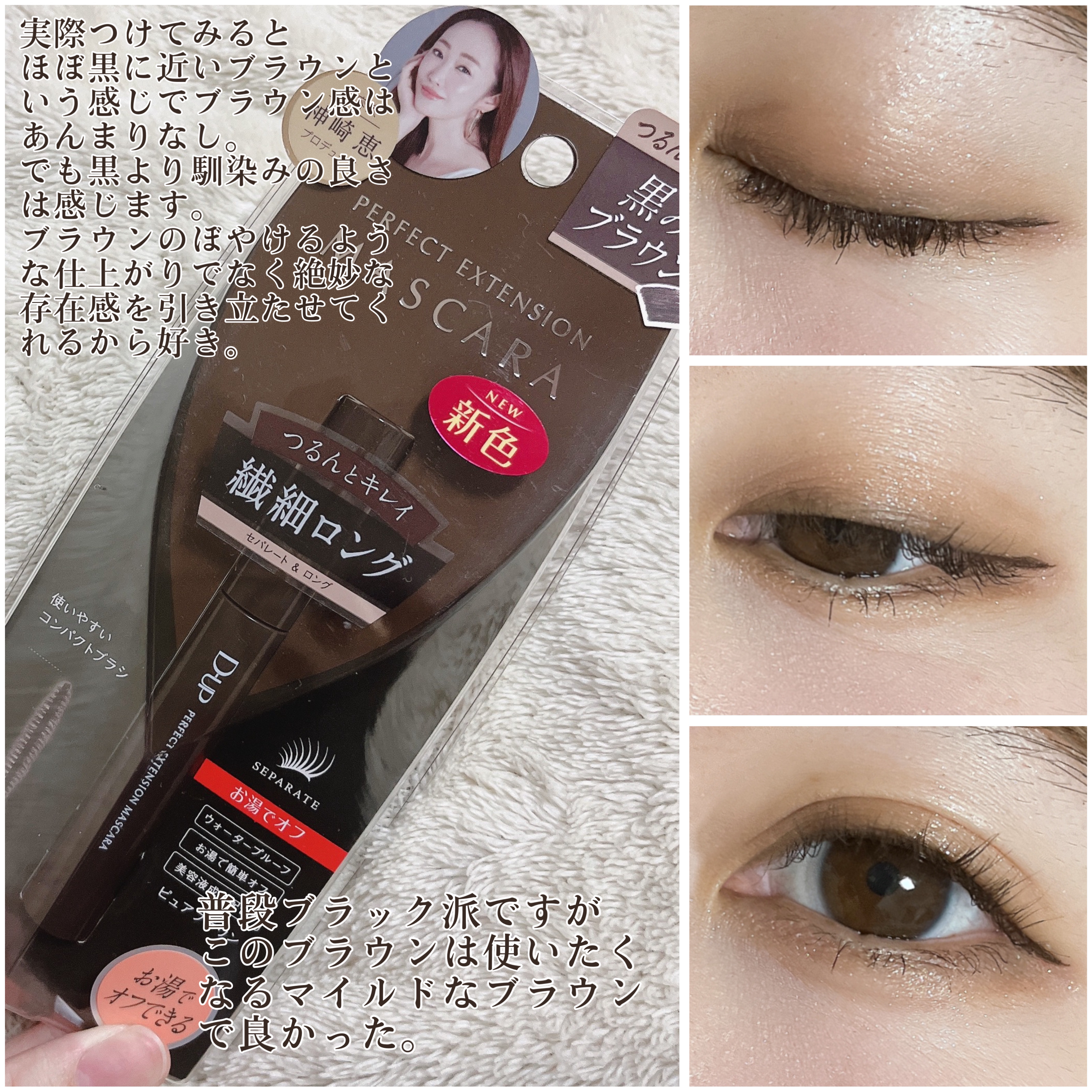 自まつ毛がスーッと伸びたような自然なセパレートまつ毛に仕上がります🥺 特にお気に入りなのはピュアブラウン🤎 美容家の神崎恵さんこだわりの“黒みブラウン”で柔らかい印象だけどナチュラルに盛れる😍 ウォータープルーフなのにお湯で簡単オフできるのがとっても魅力的でお気に入り✨