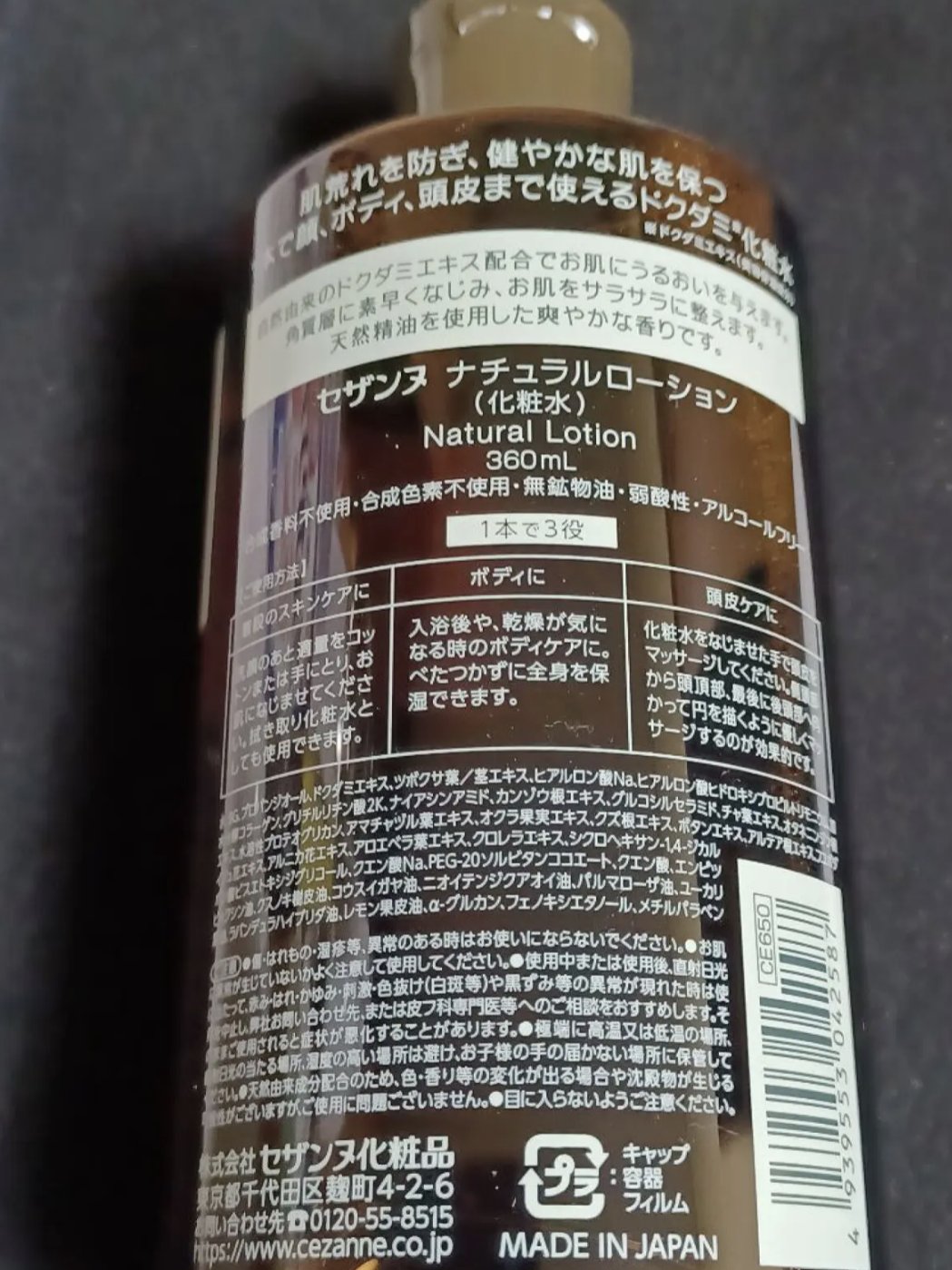 - 肌荒れを防ぎ、健やかな肌を保つドクダミ化粧水。 ドクダミエキス他、ツボクサ葉/茎エキスなどの植物エキス配合。 角質層に素早くなじみ、お肌をサラサラに整えます。 季節の変わり目や乾燥によるゆらぎ肌にうるおいを与えます。 1本で3役、顔・ボデイ・頭皮まで使えます。