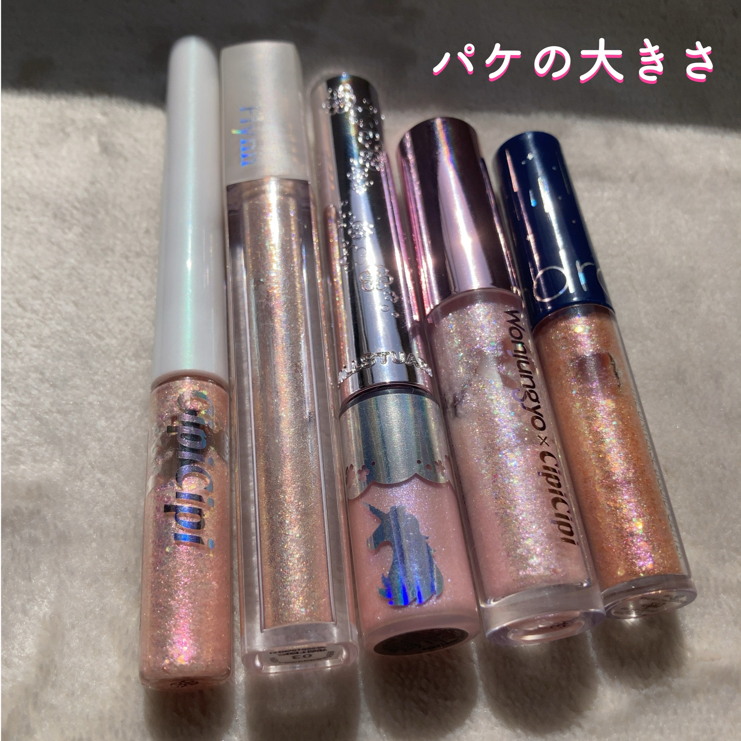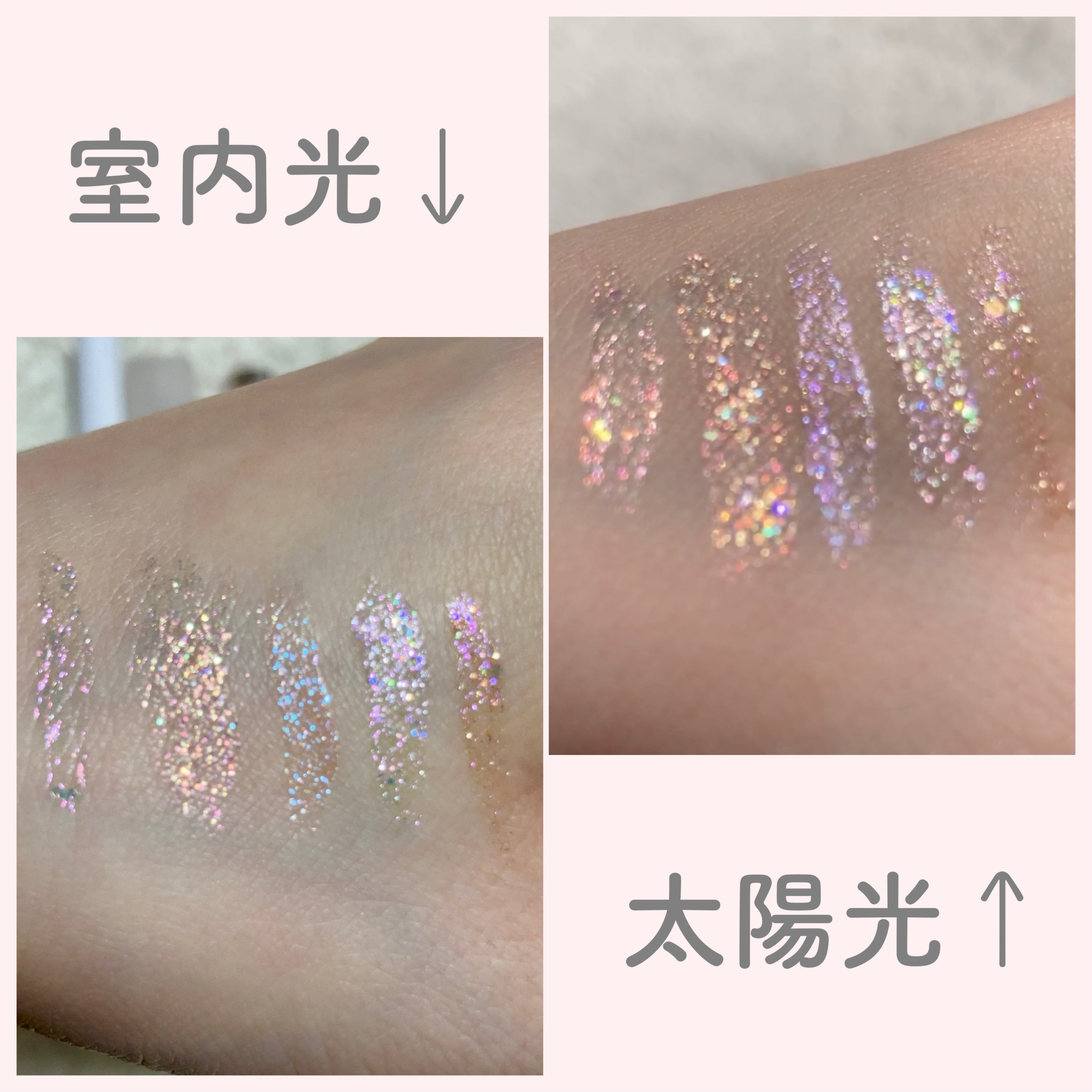あらゆるメイクに合わせやすい王道の多色グリッター ベースは透明で同じ大きさのラメがピンク、緑、青、紫、黄 シリコンタイプのアプリケーターで細く塗れる! コロンとしたパッケージに入ったラメは見てるだけでときめく💖 光の加減によってつぶつぶしちゃうタイプ。液がちょっともったりしてる。乾くとパリッと塊になるのが残念😭
