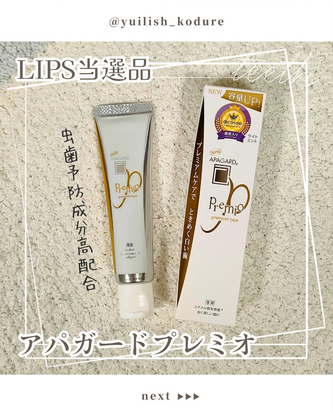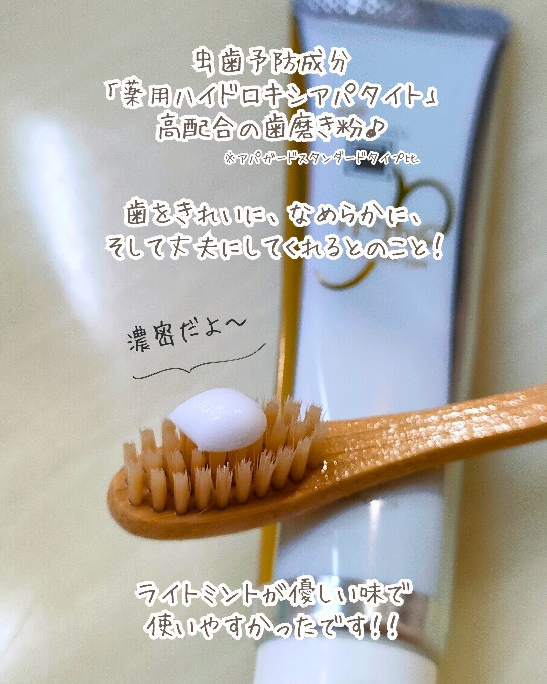 薬用ハイドロキシアパタイトを高配合(アパガードスタンダードタイプ比)となっています。 薬用ハイドロキシアパタイト<mHAP>3つの作用は・きれいに・なめらかに・丈夫にとただ歯をきれいにするだけじゃなく、歯の健康をたもつための歯磨き粉になっています…♡ 香味はきつすぎないライトミントでほどよいミントのさわやかさで泡立ちもあまりせず、長くみがけるので大好きです