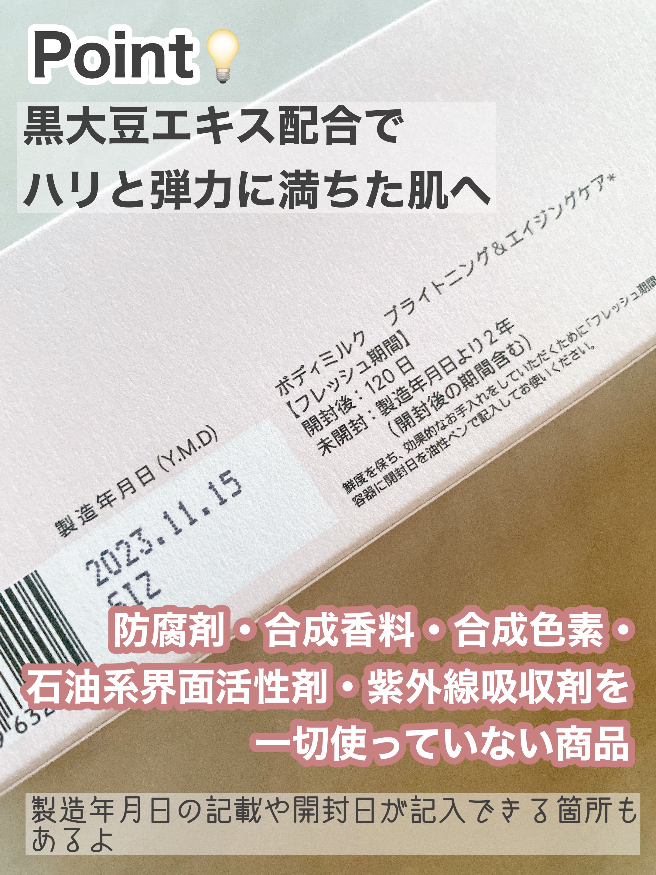 - 【医薬部外品】 「保湿・美白・エイジングケア」3つの機能を1本で叶える無添加の薬用ボディミルク。 皮脂が少ないため乾燥しやすく、日々の摩擦によるダメージでバリア機能が低下しがちなボディを、ハリとうるおいに満ちた透明肌に導きます。 なめらかにのびて肌になじみやすく、ベタつき感もありません。