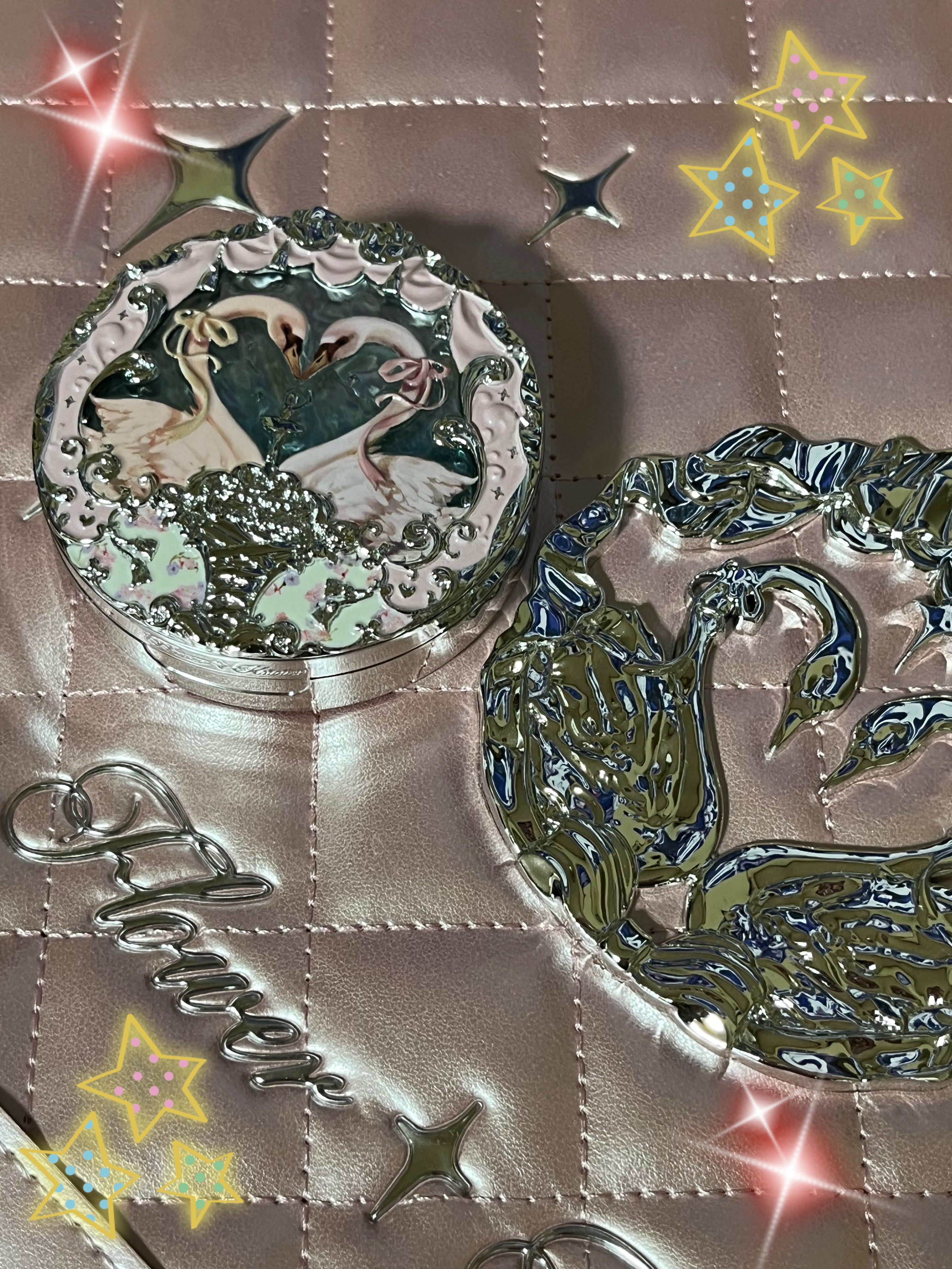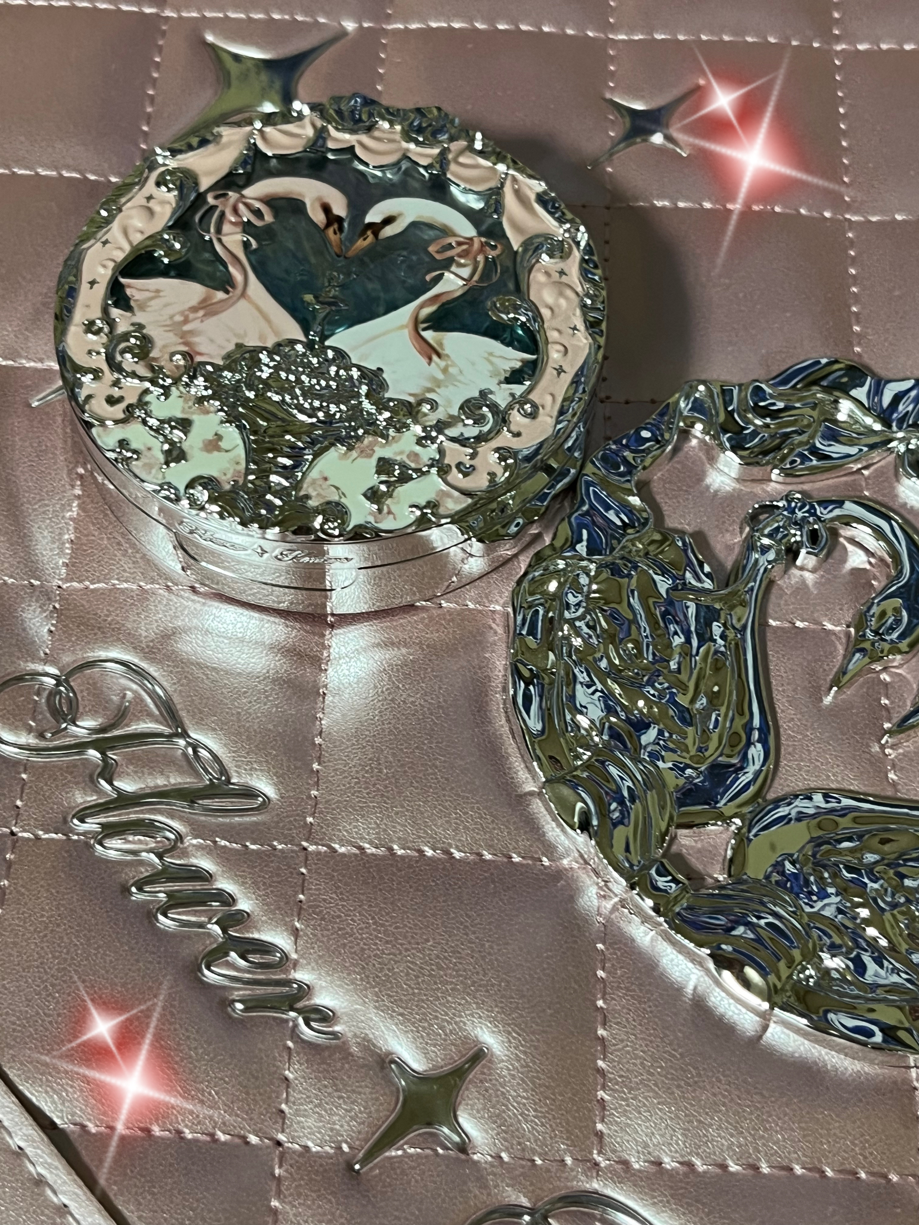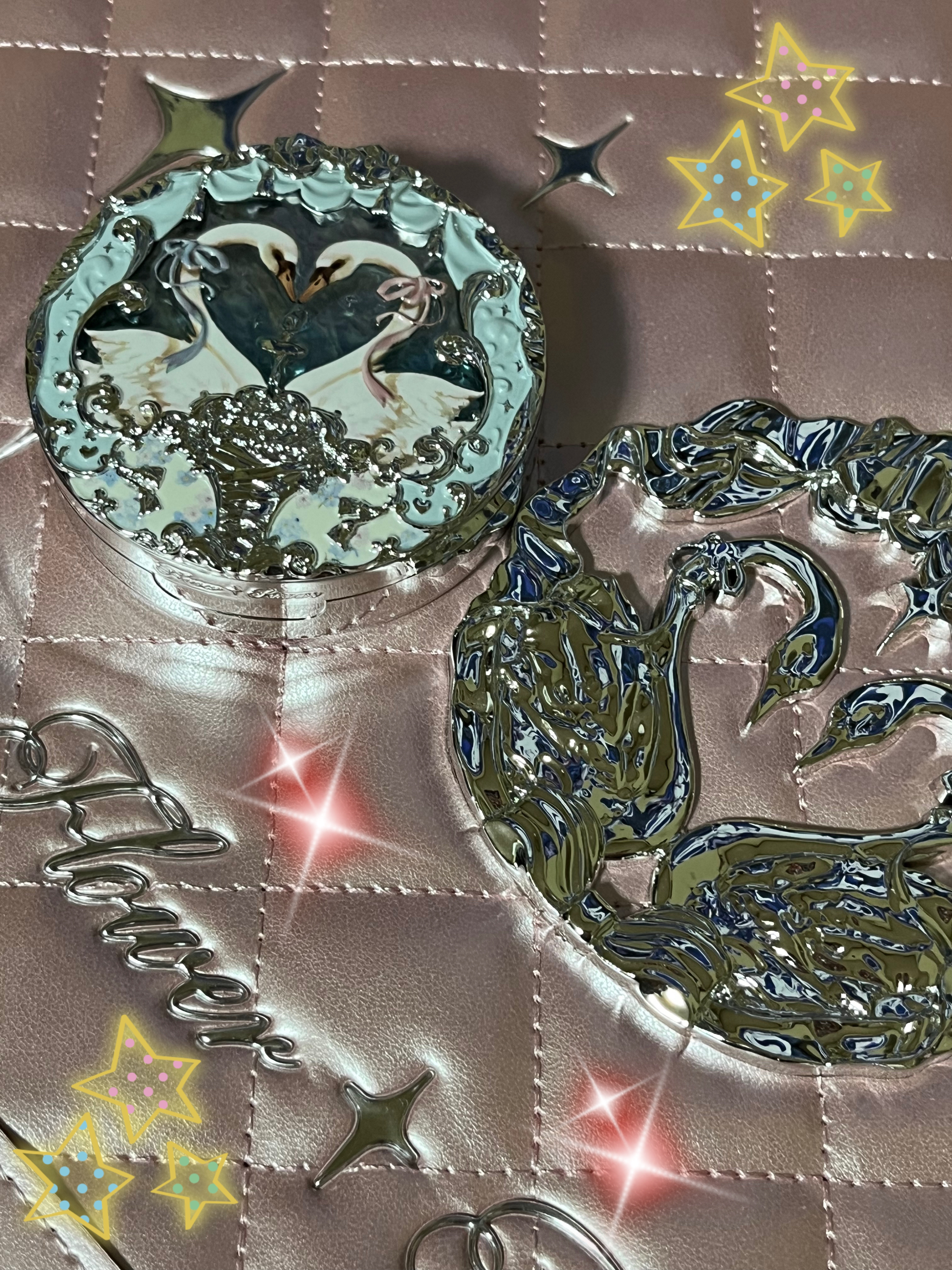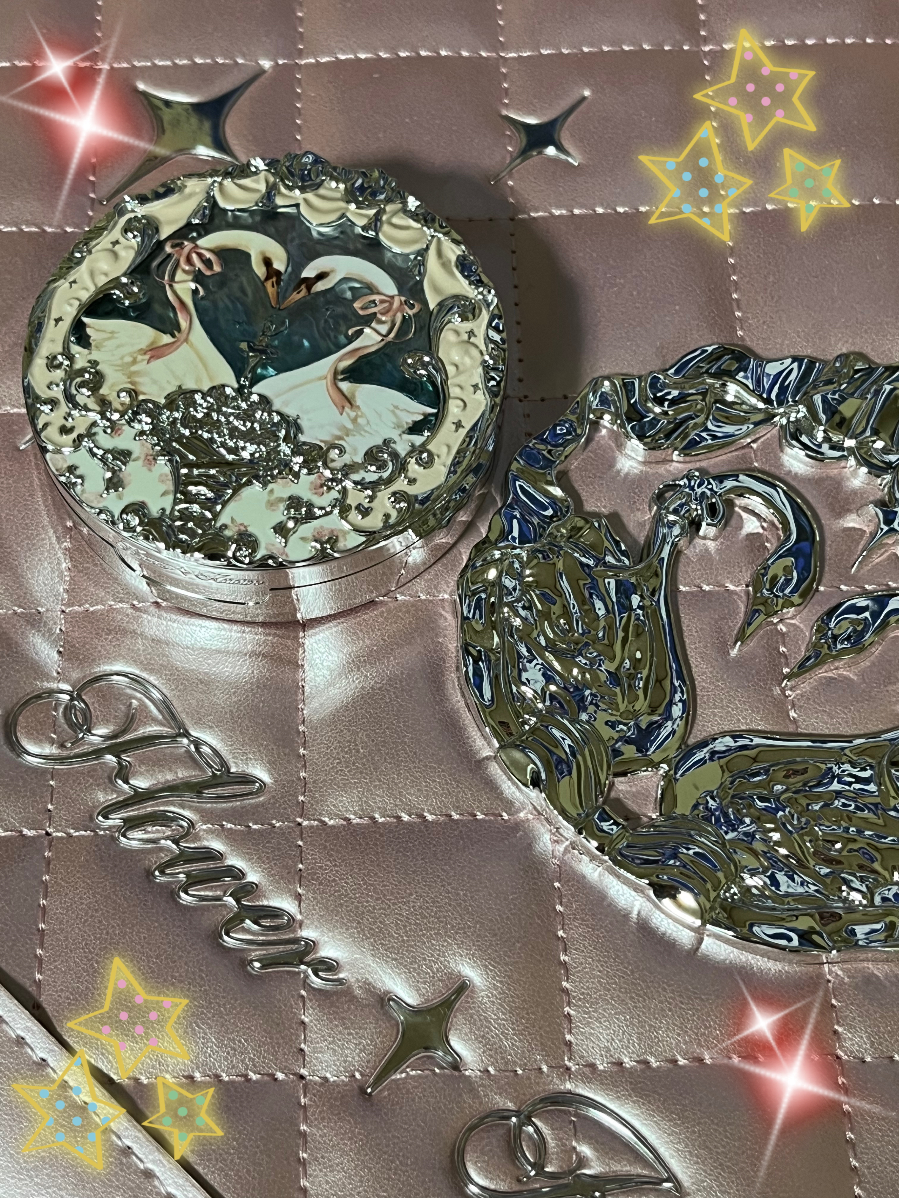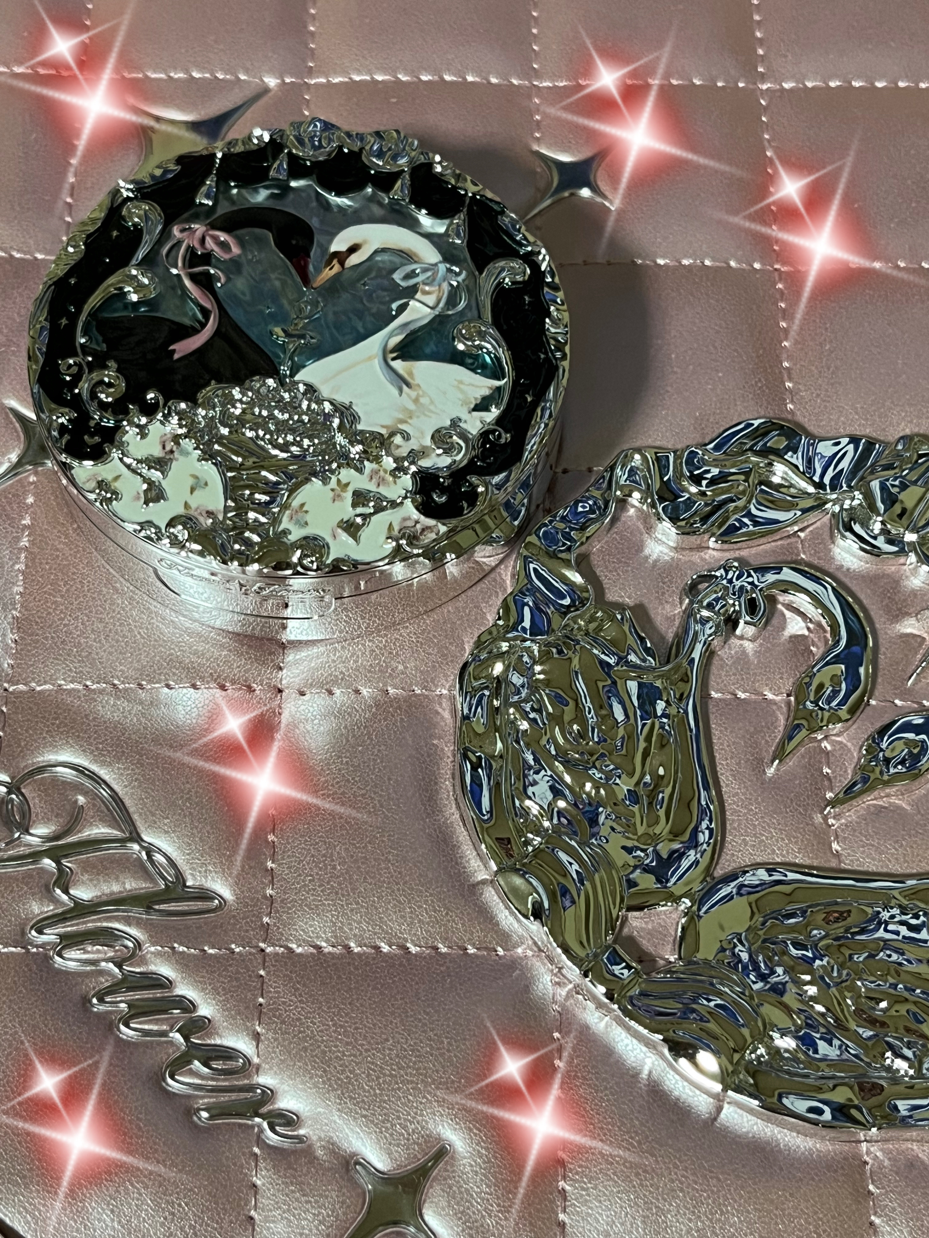 白鳥の刻印が可愛すぎて✨ 使ってるうちになくなっちゃうんですが、気分は上がる↑↑ 粉質はしっとりしていて、 見た目はっきりしたカラーですが、つける前にブラシの余分な粉落としてからつけたら濃すぎないしふんわり仕上がります💕 何より他に類を見ないパケのかわいさがあるので気になる方はぜひ!!