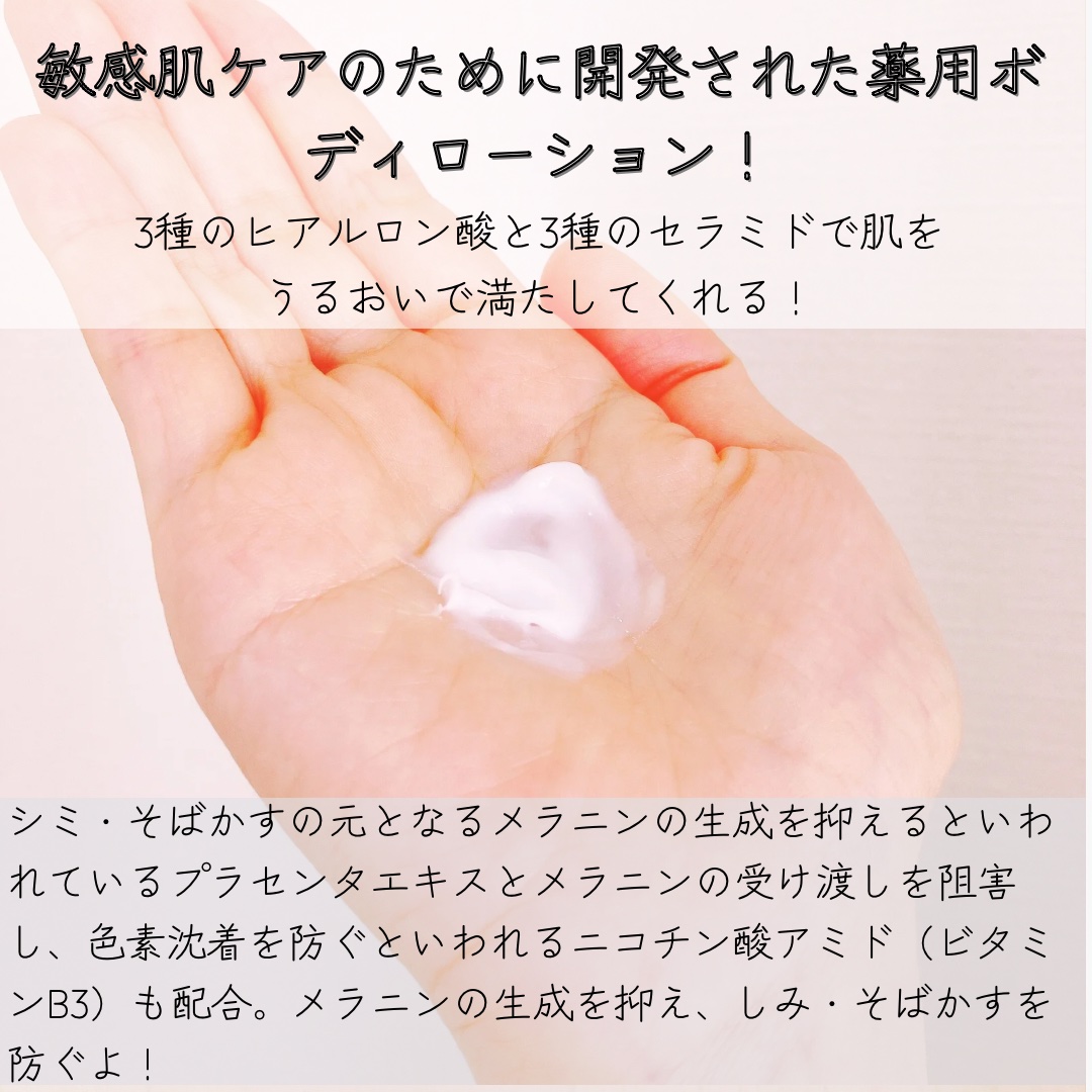 - 美白ケア×敏感肌ケア×保湿ケアを1度に! 敏感肌に使用できる、薬用美白ボディローション。べたつかずうるおいが長時間続きます。 3種のヒアルロン酸*1と3種のセラミド*2の配合処方。 <美肌ケア> 美白:有効成分/プラセンタエキス、ビタミンB3*4(ナイアシンアミド ):メラニンの生成を抑え、シミ・そばかすを防ぎます *1 ヒアルロン酸Na-2, 加水分解ヒアルロン酸, アセチル化ヒアルロン酸ナトリウム:うるおい保持成分 *2 N-ステアロイルジヒドロスフィンゴシン, ステアロイルフィトスフィンゴシン, ヒドロキシステアリルフィトスフィンゴシン:うるおい成分 *3 角質層内 *4 ニコチン酸アミド