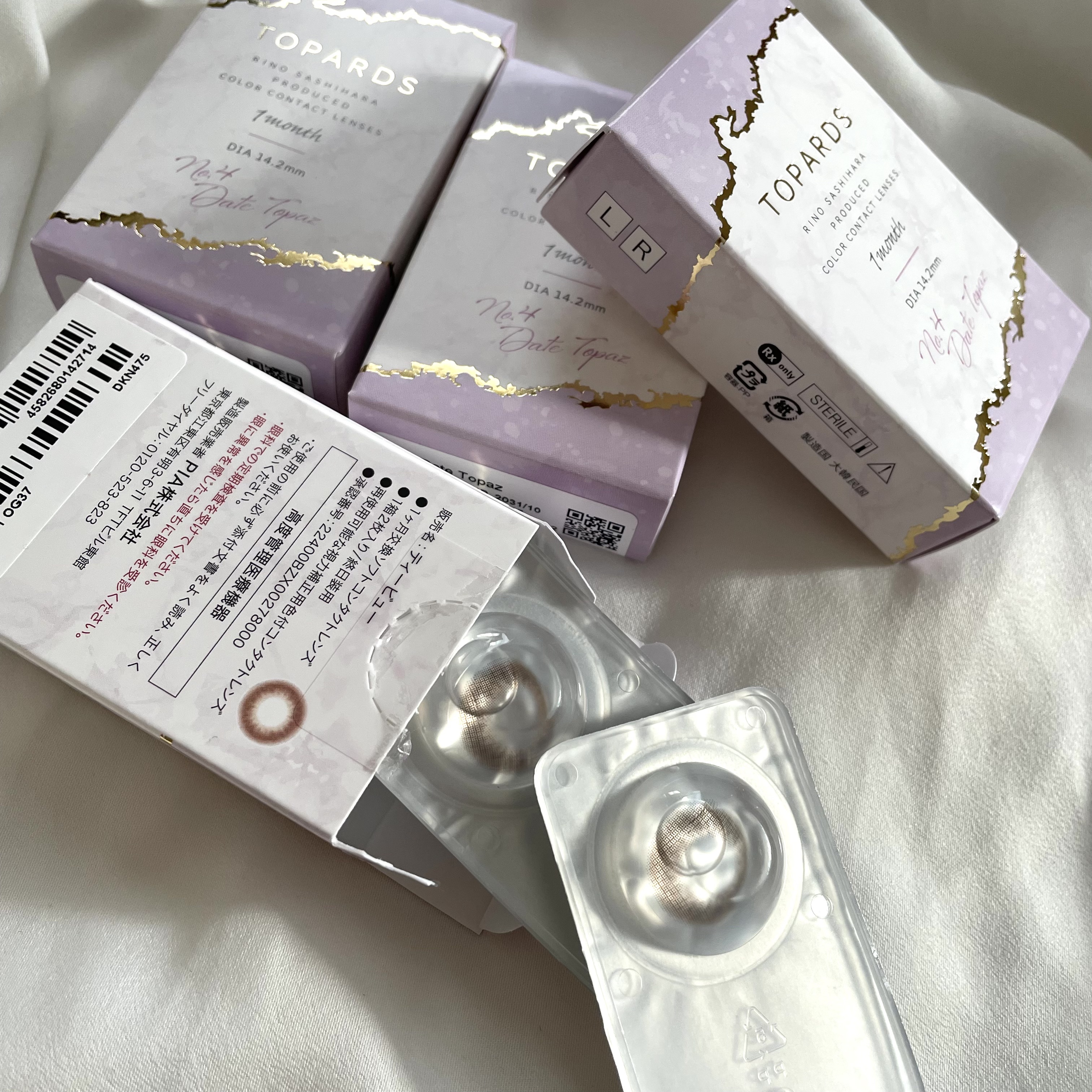 - ※2025年6月以降、商品パッケージ裏面・側面の一部表記を順次変更いたします。尚、これにかかる商品の交換・返品は承っておりません。 『TOPARDS(トパーズ)』は、透明感とうるおいのある瞳にこだわって開発されたカラーコンタクトレンズブランドです。 うるうる・キラキラした瞳に映り、どんなシーンにも馴染んでくれる商品となっております。 Date Topaz(デートトパーズ) DIA:14.2mm/着色直径13.4mm 着けてるとバレにくくこっそり可愛いが仕込めるふんわりデザイン。 Strawberry Quartz(ストロベリークォーツ) DIA:14.2mm/着色直径13.5mm ブラウンカラーにピンクをほんのりプラス。 着けることで一気に甘い顔にみせるレンズ。 Garnet(ガーネット) DIA:14.2mm/着色直径13.5mm ハイライトカラーが、ヘルシーな血色感と輝きをプラス。 洒落感ライトブラウン。 Cream Rose(クリームローズ) DIA14.2mm/着色直径13.4mm まろやかピンクが上品かわいいちゅるんローズブラウン。 Mocha Ring(モカリング) /DIA14.5mm/着色直径13.7mm くりっとフチで甘さたっぷりの瞳♡愛されモカブラウン。 Jelly Quartz(ゼリークォーツ) /DIA14.2mm/着色直径13.6mm ぼかし細フチでぷるんと輝く瞳に、毎日使いたくなる引き算大人盛れレンズ。 カラーコンタクトレンズの不適正使用による眼障害の危険性等などがあります。 ●コンタクトレンズは高度管理医療機器です。不十分な洗浄・消毒など不適切なケアや、長時間・交換期間を超えた装用により、アレルギー性結膜炎、角膜感染症、角膜潰瘍等の重篤な眼障害が発生する危険性があります ●ご使用前に取扱説明書を確認してください 使用上の留意事項 ●眼科医院等を受診してからお求めください ●眼に異常を感じたら直ちにレンズ使用を中止し、お近くの眼科等で診察を受けてください ●医師の指示にしたがってご使用ください ●コンタクトレンズを装用する場合、自覚症状がなくても、眼科医院等での定期検査を受けてください ●レンズに不具合がある場合は使用しないでください