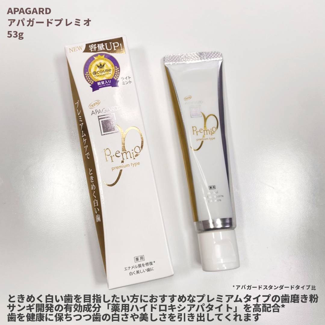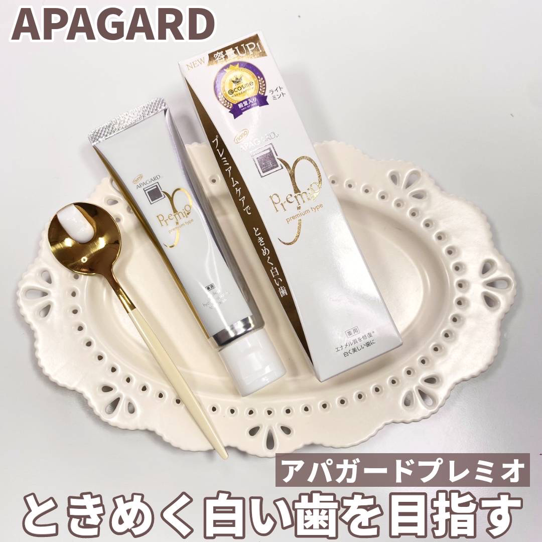 - 【医薬部外品】 独自成分「薬用ハイドロキシアパタイト」がエナメル質を整えてむし歯を予防。アパガードはエナメル質の健康を保つことで自然な白い歯に導く美白歯みがきブランド。アパガードプレミオは「薬用ハイドロキシアパタイト」を高配合(スタンダードタイプ比)。プレミアムケアでときめく白い歯に。 <ライトミント> ●サンギ独自の薬用成分ナノ粒子「薬用ハイドロキシアパタイト」を高配合したプレミアムタイプ。※Mプラス、スモーキン比 ●歯の再石灰化率、白色度もアップ。 ●歯垢を吸着除去し、歯のエナメル質の目に見えない傷を埋め、ミネラル欠損部(初期むし歯)を再石灰化するナノ<mHAP>の3つの働きで、むし歯を予防。 ●パール成分(加水分解コンキオリン液)配合。 <エクストラミント> ●強めのミントがお好みの方におススメ!ミント強めの「エクストラミント」フレーバー。 ●サンギ独自の薬用成分ナノ粒子「薬用ハイドロキシアパタイト」を高配合したプレミアムタイプ。※Mプラス、スモーキン比 ●歯垢を吸着除去、エナメル質表面の目に見えない傷を埋めてなめらかに、エナメル質から溶け出したミネラルを補給(再石灰化)する、という薬用ハイドロキシアパタイトの3つの作用でむし歯を予防。 ●パール成分(加水分解コンキオリン液)を追加したブライトニング処方