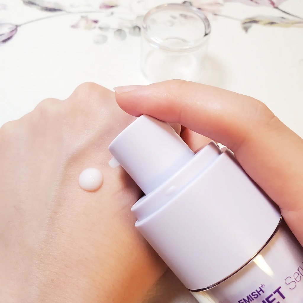 韓国のオリーブヤングで人気の毛穴ケア*セラム *潤いで毛穴が目立たなくなること バクチオール シカPDRN ナイアシンアミド ビタミンC誘導体を配合✨(保湿成分) 淡いパープルカラーの容器 セラムを使い切った後はリフィル容器に変えて再使用もできるみたいです◎