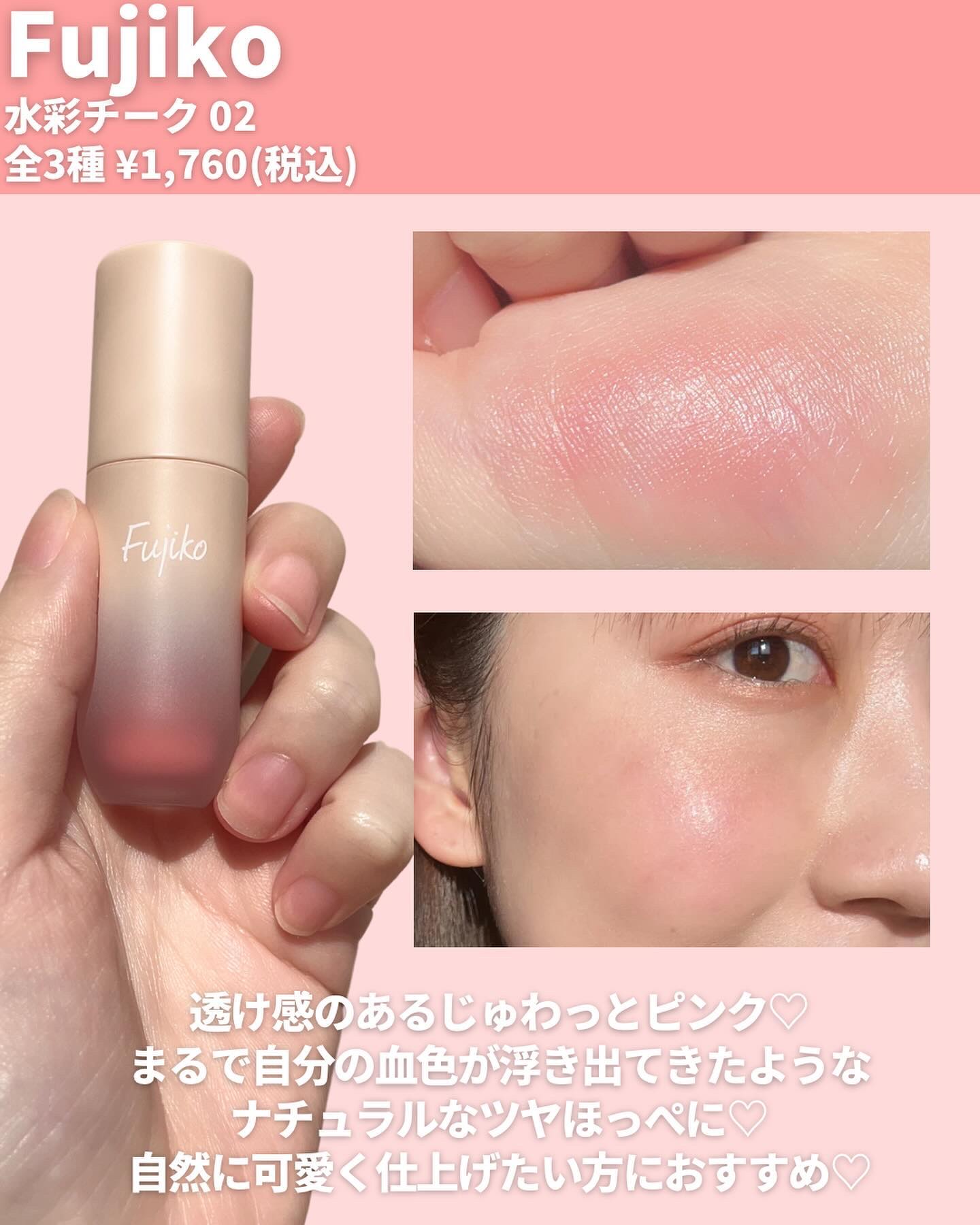 血色感・多幸感をプラスしてくれるFujikoの⽔彩チーク👼🏻✨🌟Fujiko⽔彩チーク[02マイラブリーピンク] 【参考価格】¥1,760乾燥が気になる時期やツヤ肌に仕上げたい時はパウダーチークよりもリキッドチーク❕Fujikoの⽔彩チークは...