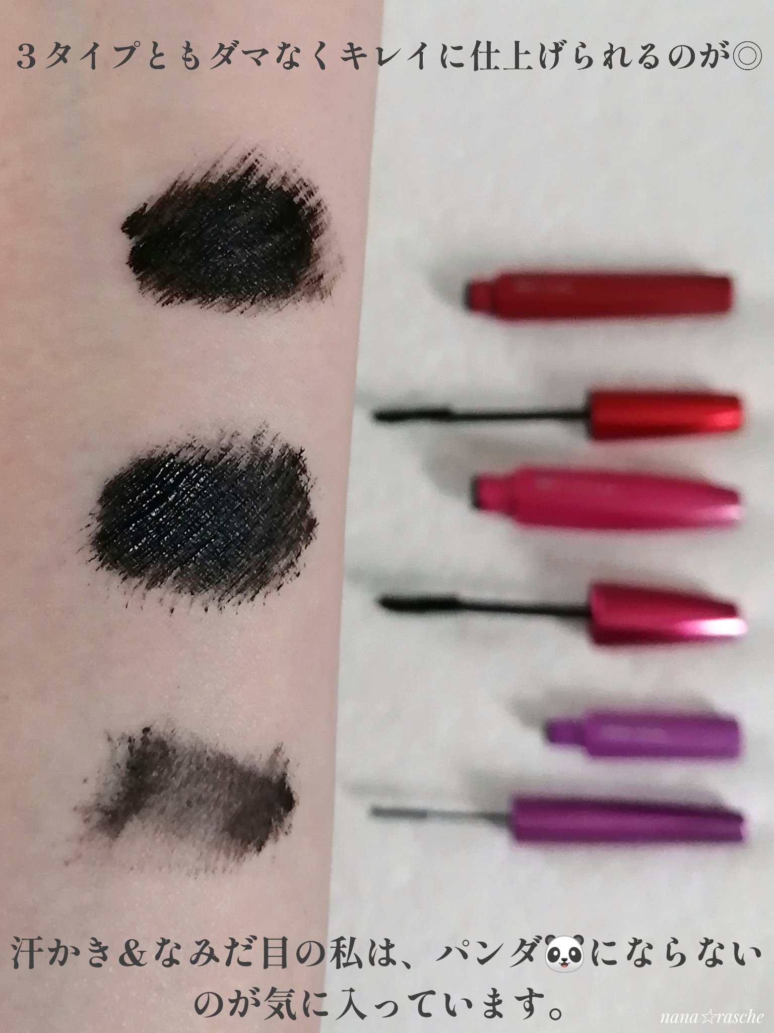 塗るほどに長くなるロングタイプ まつげ1本1本をダマなく太くするボリュームタイプ “見えないまつげ”も際立てる自まつげ際立てタイプ 「塗るまつげ」は極細ブラシの自まつげ際立てタイプだけでなく たっぷりマスカラ液が絡む大きめブラシのロングタイプとボリュームタイプも 汗かき&なみだ目でもパンダにならないし、お湯でするんと簡単にオフ出来るし大満足です。