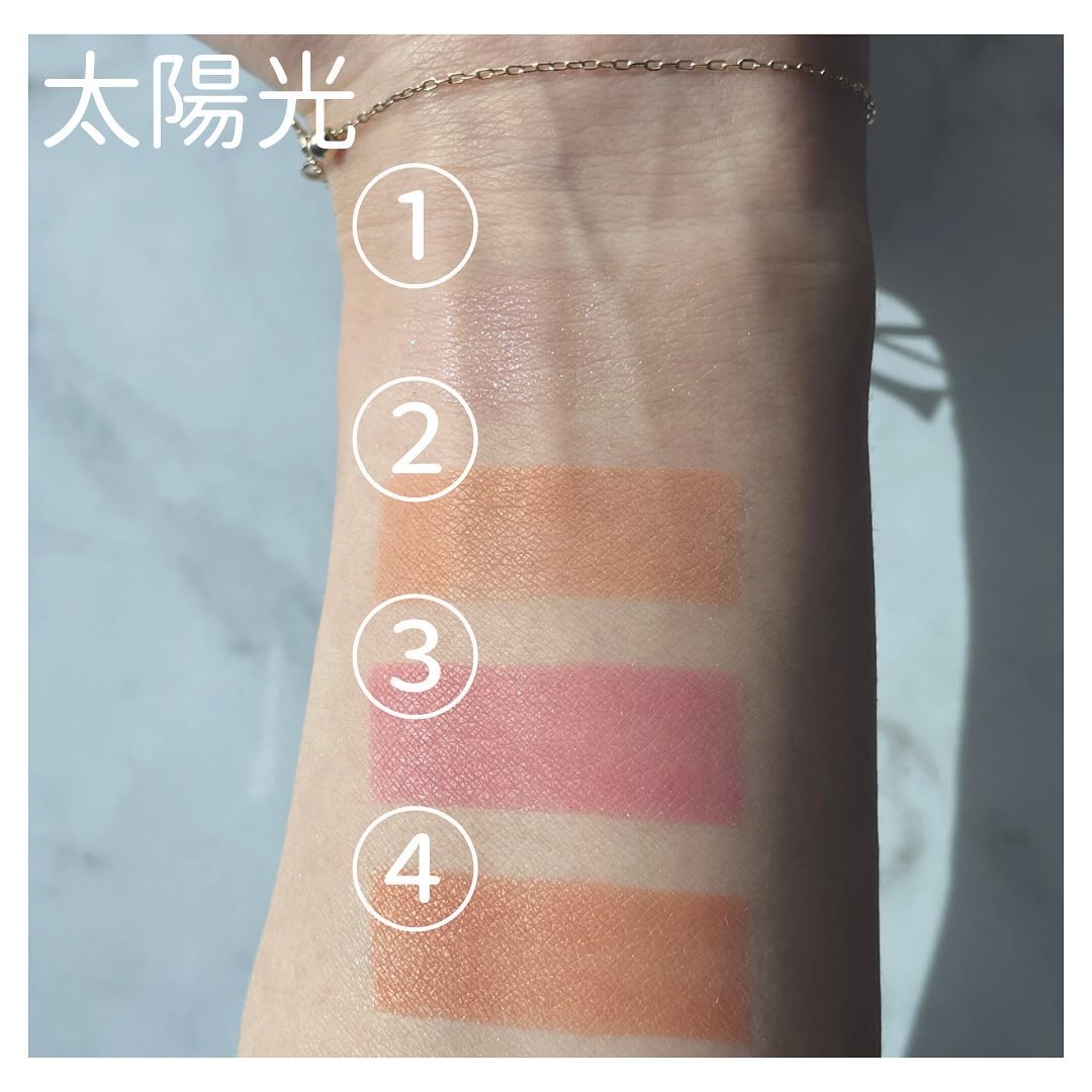 ツヤと血色感、両方手に入る欲張りチーク✨ 粘度が低い液体で、サッと滑らせるだけでも綺麗につきます(スウォッチは指で3回伸ばした) 指で伸ばしてから境目をぽんぽんするだけでも良いですが、スポンジで丁寧に馴染ませるとより自然な仕上がりに✨ スウォッチはピーチピンク&ゴールデンシマーのゴールドパールが目立ちますが、少量頬につけて馴染ませると意外とキラキラした感じがなくて艶に見えます👀 ブルベなので、ソフトライラック1本だけでも良かったんですが、青みが少ないアイメイクをする時はモーヴピンクを使うことも ピーチピンク&ゴールデンシマーはゴールドパールが入っているのでマットのアイシャドウとの相性はちょっと微妙、下2色はどんな質感のアイシャドウとも相性が良いかと思います このリキッドチークは色展開も豊富で購入する時迷いましたが(3/12現在で9色)、モーヴピンクかソフトライラックが失敗が少ないかもしれません