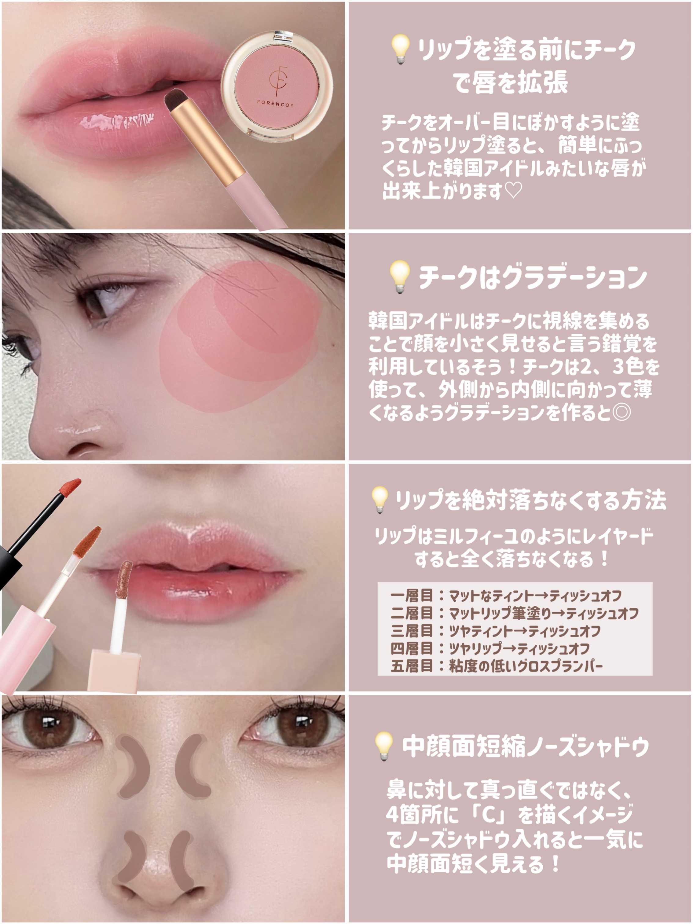 小顔になりたい人必見 小顔チークのやり方は簡単です! まずは、いつも使っているチークと明るくて淡い色のチークを用意します。 1️⃣ L字型に明るい色のチークを入れる 2️⃣ ⬜︎の中にいつも使っているチークを入れる 2色のチークとシェーディングの陰影で ナチュラルに小顔に見せることができます!