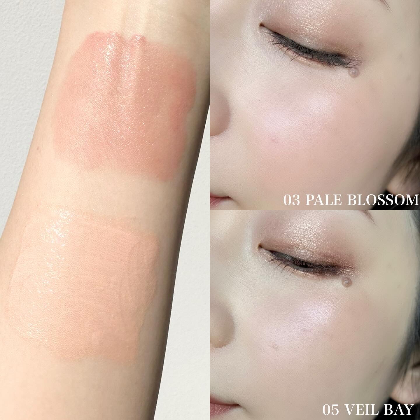 手に試した感じではベースのブルーは弱く、ラメ自体がブルーで可愛すぎる…! BAさんはパウダーアイシャドウのベースにもおすすめと教えてくれたので、 今日はこちらをベースにピンクブラウン系の アイシャドウを使ってメイクしてみたよ🫶🏻 肌に伸ばすとすぐにサラサラになるから ベタベタが残ったりしないし、 パウダーアイシャドウの上に重ねてもヨレない◎