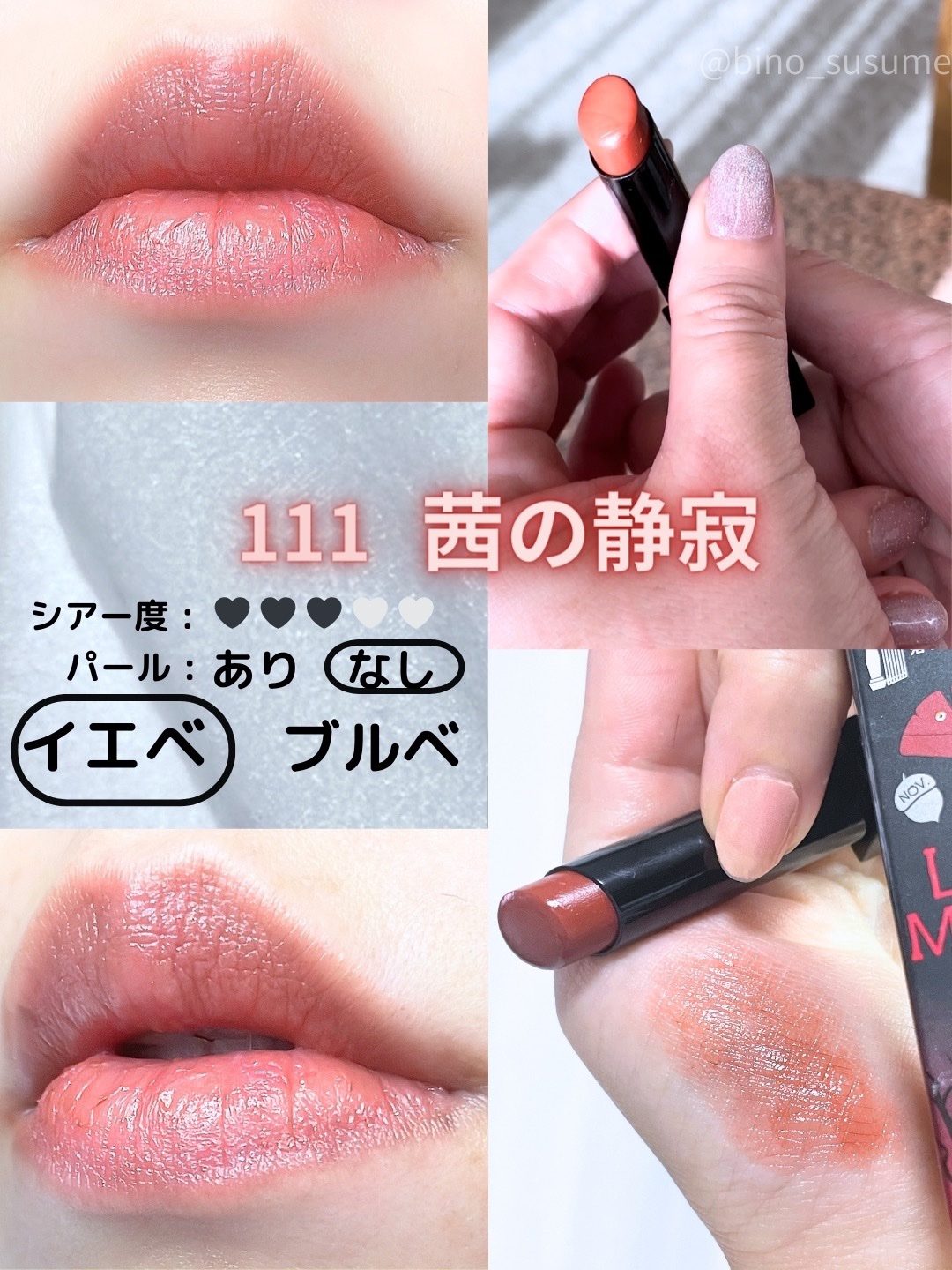 フタを開けるとブラウンでイエベでもオータム寄り?かなと思えるカラー。つけてみると、あれデパスカラー😍❓ これ今回の優勝カラーなんじゃないかな? こちらもイエベよりのカラー。赤なので結構強く出るのかなと思いきや、少しシアーな感じなので、赤といっても肌馴染みよく赤を使い慣れていない方でも使いやすいカラーだと思います。 こちらはイエベ、ブルベ使えるカラーだと思います。他の2色と同じくシアーな感じではあるので、シックなカラーですが深くなりすぎることなく使えます!グリーンパールが配合されていますが、ご覧の通りほとんど目立たないです😊