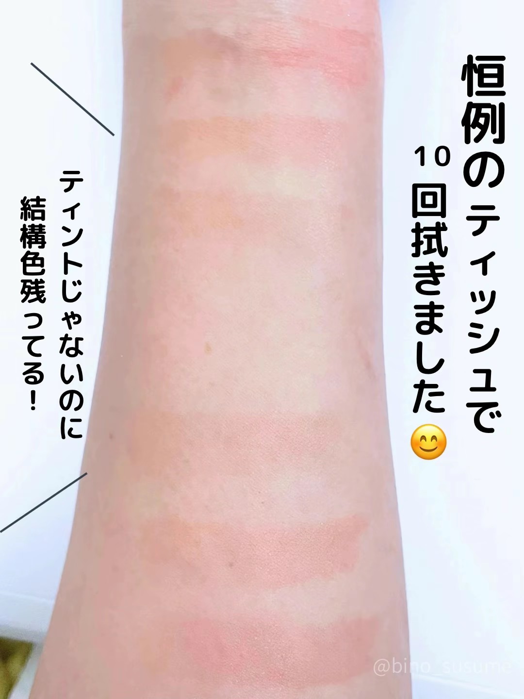 ☑️とろけるようになめらかな使い心地のスティックルージュ。 ☑️ジェル膜処方で、洗練カラー&質感がそのまま続く ☑️シアーな美発色でナチュラルにツヤっぽい唇が続く 大きさは手の指1本分ぐらいの長さで携帯しやすいサイズと感じました。 &beのシアーリップは1度塗りでは透け感ありつつも色の存在感はしっかりありますが、濃くなりすぎない絶妙な付き具合です。 オイルとワックスの組み合わせ技術で伸び広がる心地よいテクスチャーが作り出されているとのこと。 8つの無添加(合成界面活性剤、鉱物油、紫外線吸収剤、エタノール、パラベン、シリコーンオイル、香料、合成酸化防止剤、不使用🙅) 水分を含むとゲル化するモイストフィックスオイルが、唇の水分でジェル状の膜を形成し、ロングラスティング&2次付着防止処方されている。 10回ぐらい拭いても結構色が残っていて色持ちの良さを実感しました。 ポイントメイク落としで唇を拭いていますが、色残りせずにしっかりと落とせました。