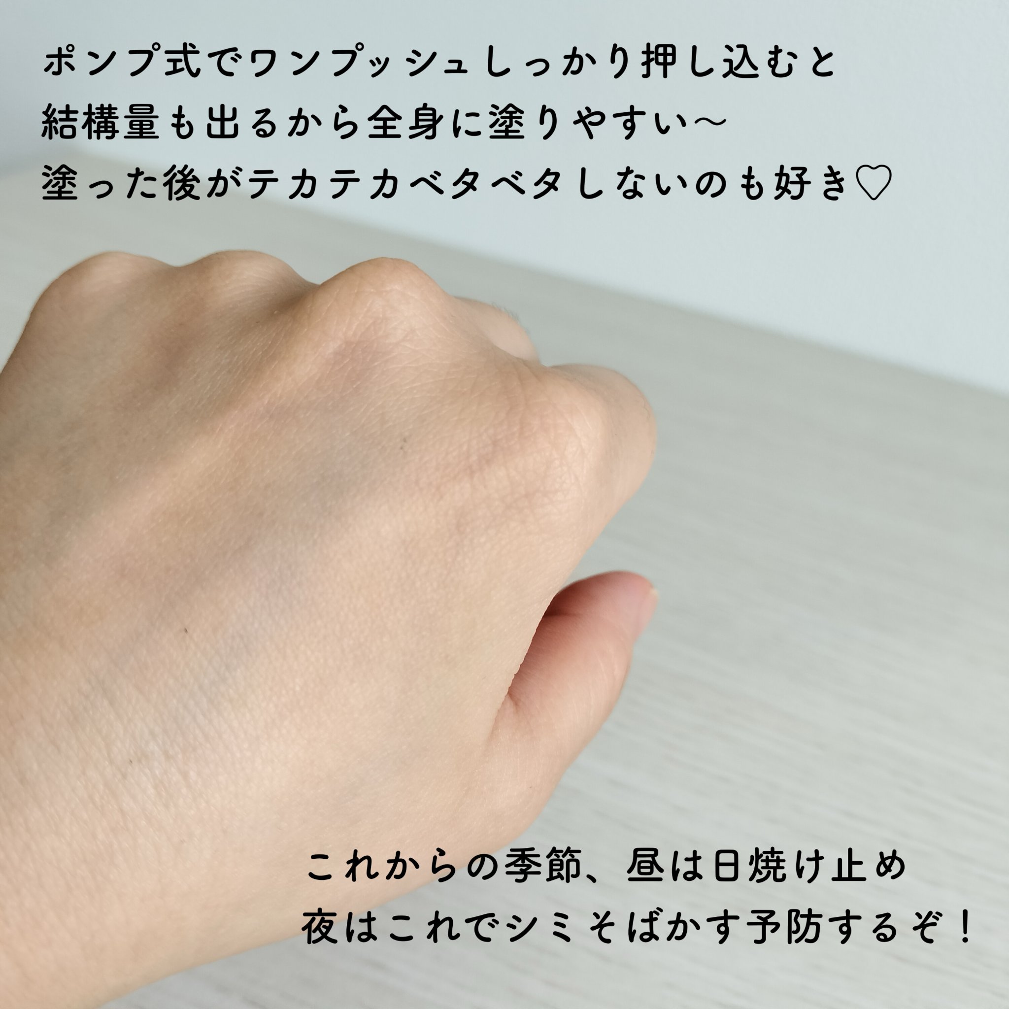 私には合わなかったみたい・・・ 結果だけ言うと頬の一部が不自然に色抜けしてて 白斑の可能性あるなぁと。 やっぱり何かしらが合わなかったのだと判断して一旦中断。 使える人がうらやましい高機能美容液。 大体の方が高評価なレビューですし サンプルから試してみるのをおすすめします!