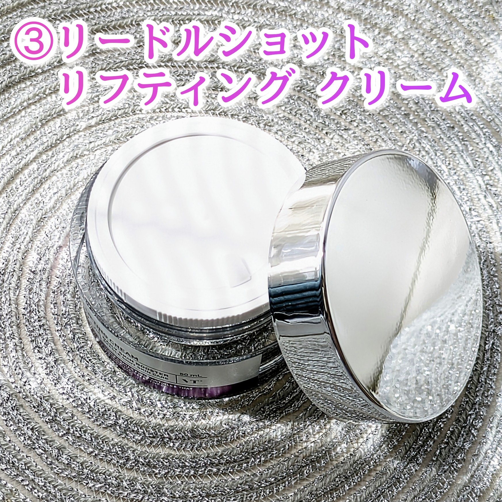 リードルショット💉という名前ですが 天然成分です🌿 こちらの3点共、わたしは全くチクチクしませんでした😊 具体的に・・・ CICA REEDLE™ 約15μm ⇦ 毛穴より小さい (リードルが美容成分を届ける道をつくる仕組み) 感動したのは、触っただけで優しく振動すること!! まずチューブ部分を軽く押して、クリームを出します。 その後で、指でシルバーの首部分を持って肌に当てると 優しく振動します🎶 最後は、しっとりクリーム✨ しっとりした柔らかいクリームです。 塗った後は、もっちり & ハリとツヤを感じました⤴⤴ 箱もかわいいので、プレゼントにも🎁