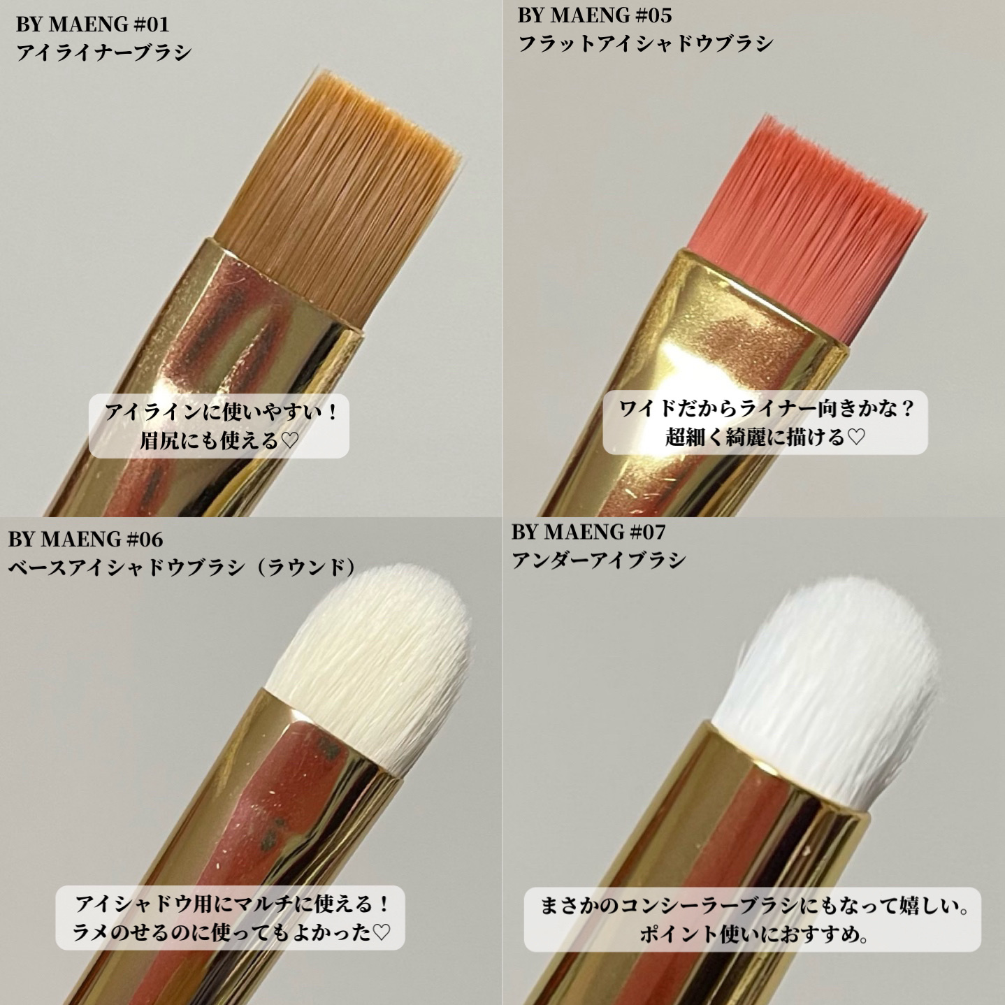 初心者でもプロのような仕上がりになれるメイクブラシ🤍 白玉ファンデーションブラシは宮脇咲良ちゃんもYouTubeで紹介していたみたい!😻🩷🩷 ふんわりとした柔らかいブラシで、簡単に毛穴カバーできる✨ コシもあるから隅々まで密着させてのせられるのが嬉しい✨ ベースアイシャドウブラシはマット、パールのシャドウを粉飛びせずに簡単にのせられる万能ブラシ🤍 はっきりとした色味のアイシャドウも濃過ぎず付けられるから、柔らかい印象に仕上がるよ🧡