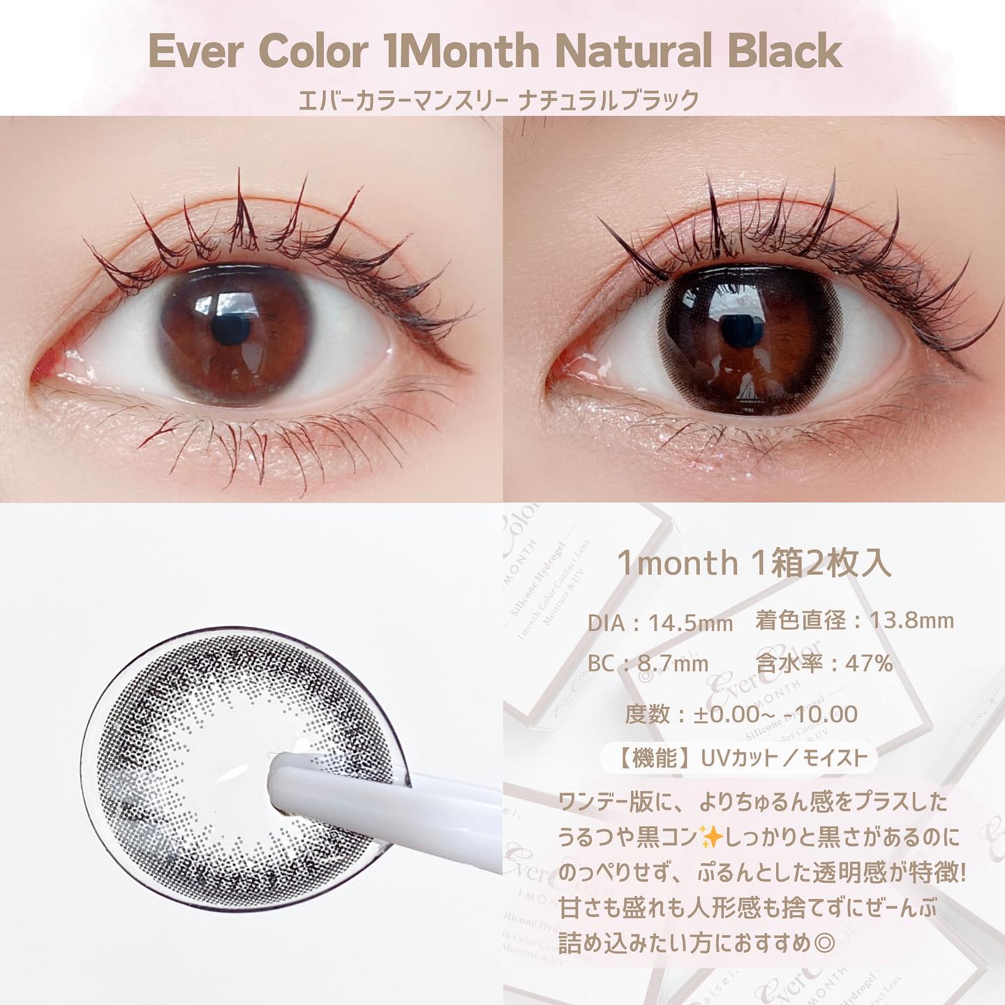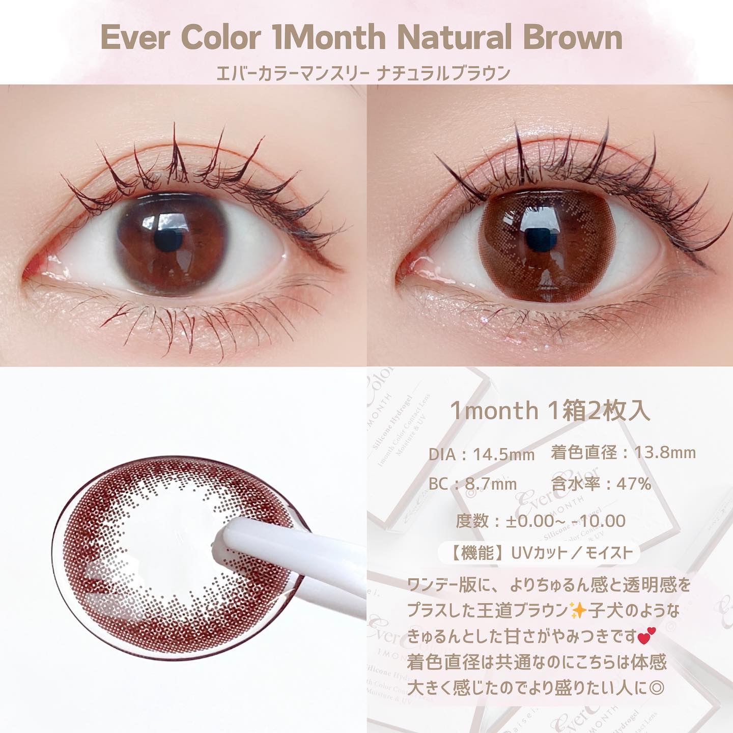 - ●瞳にやさしい使い心地、ずっとカワイイ『シリコーンハイドロゲル素材』を採用 エバーカラーマンスリーは、快適なつけ心地を追求したシリコーンハイドロゲル素材を採用しています。高い酸素透過率で角膜に必要な酸素をしっかり届け、うるおいを保つことで、裸眼のような解放感を追求しました。 ※当社の表現する装用感には個人差があります 瞳に馴染むのに盛れる、新色「ミルクブラウニー」「テディモカ」の2カラーが誕生しました。 ■テディモカ(Teddy Mocha) 甘モテ♡色っぽちゅるんオトナのミュートブラウン くりっと甘い盛り感で色気ただよう、ちゅるんな瞳 ■ミルクブラウニー(Milk Brownie) “ナチュ盛り♡ふわちゅるん”ピュアなブラウンベージュ 柔らかなミルクブラウンで甘さたっぷり、ピュアな瞳 カラーコンタクトレンズの不適正使用による眼障害の危険性等などがあります。 ●コンタクトレンズは高度管理医療機器です。不十分な洗浄・消毒など不適切なケアや、長時間・交換期間を超えた装用により、アレルギー性結膜炎、角膜感染症、角膜潰瘍等の重篤な眼障害が発生する危険性があります ●ご使用前に取扱説明書を確認してください 使用上の留意事項 ●眼科医院等を受診してからお求めください ●眼に異常を感じたら直ちにレンズ使用を中止し、お近くの眼科等で診察を受けてください ●医師の指示にしたがってご使用ください ●コンタクトレンズを装用する場合、自覚症状がなくても、眼科医院等での定期検査を受けてください ●レンズに不具合がある場合は使用しないでください
