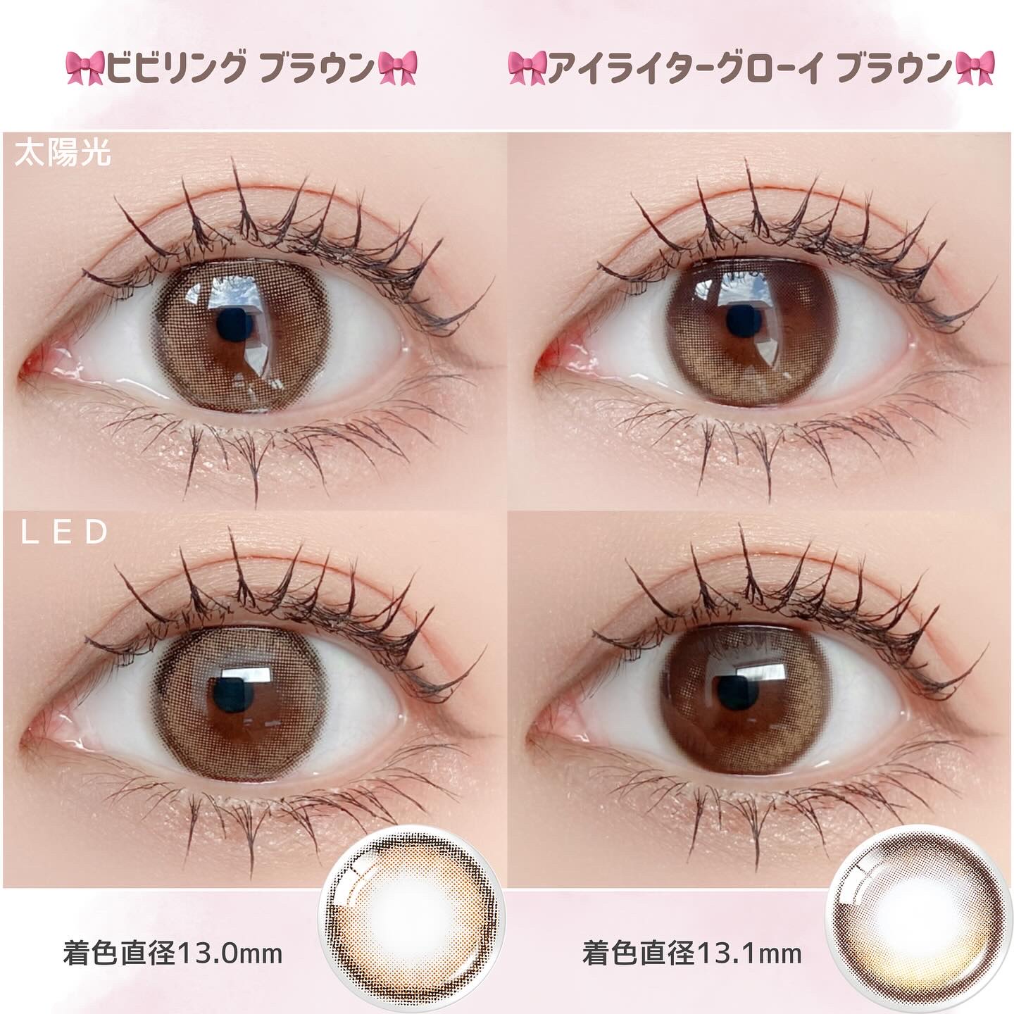 ぼかしフチが自然になじんでかわいい! 着色13.0mmというサイズ感もつかいやすい! 愛らしい雰囲気を味わいたくてピンクを選びましたが、私の瞳では紫っぽく発色しました。 ちょっぴりミステリアスな雰囲気! なじみがいいのにどことなくかわいい、失敗しにくいカラコンだと感じました。