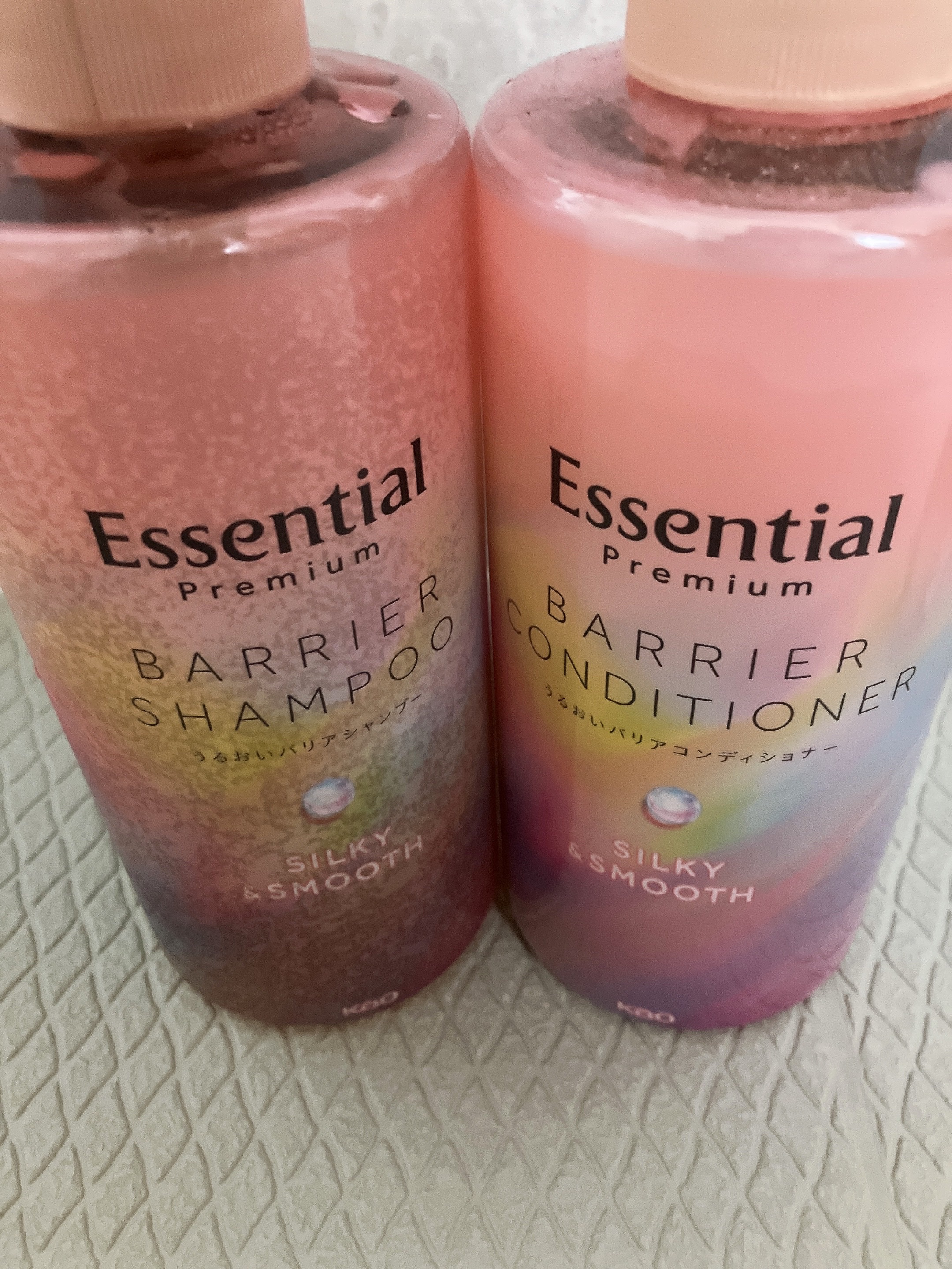 ♡エッセンシャル♡エッセンシャルプレミアムバリアシャンプー・コンディショナーシルキー&スムースシャンプーはふわふわ泡立ちが良く、全体的にピーチの香りに包まれとても幸せな気分になりました🍑コンディショナーをすると指通りがつるんと全体的なまとまり...