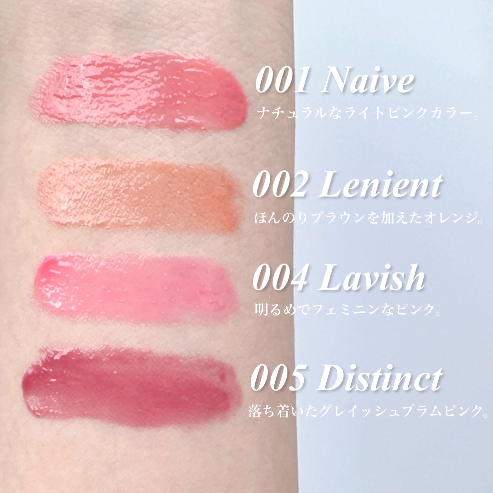 - White コンセプト / Blackコンセプトでお馴染みのCoralhazeから新たに6色追加となります。 特にBlackコンセプトに対する期待の声が寄せられていたこともあり、今回Black コンセプトから既存のBlack LineよりもさらにトーンダウンしたDark Lineが新登場。 番号の前にWが付いている商品はwhite Line、Bがついている商品はBlack Line、Dが付いている商品はDark Lineとなります。 1.唇に軽くメルティングされ蜂蜜を塗ったようなプルンとした輝きを与えます 2.プランパー成分配合でクーリング感とともにふっくらとしたボリューム、ツヤ感を与えます 3.ベタつきの少ないテクスチャーで重ね塗りしても快適に使用 4.パーソナルカラーに合わせて選べる10種類のカラー 5.高級感のあるゴールド色の容器を使用し感性的な満足感をお届けします 6.唇を保護し、保湿感を与えるスキンケア成分を配合 韓国では 「自身が持っている魅力をコーラルヘイズがより引き出す」 というパステルカラー調のコンセプトになっておりますが日本では今までの韓国コスメにはない、Black or White コンセプトになっております。 Black Lineはブラウンチョコレートを一滴垂らしたようなカラー White Lineは生クリームを一滴垂らしたようなカラー