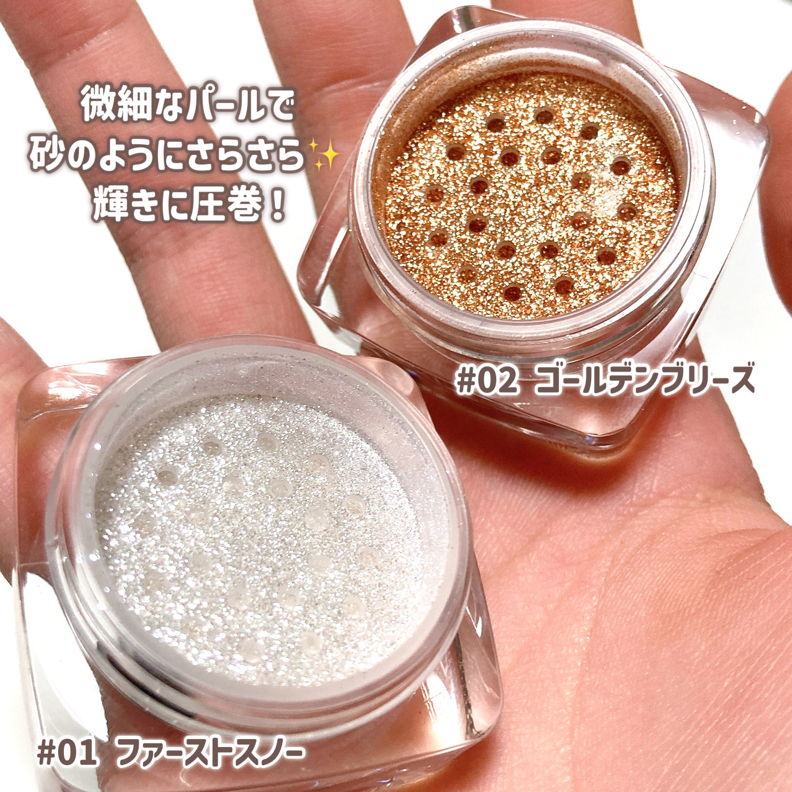 今まで見たことないクールトーンの為のグリッターパウダー3種セット クールトーンの為のホワイト、ピンク、パープルカラー構成で不思議なムードのクールトーンルックが演出できる 接着剤なしで100%パール原料だけを使用したグリッターパウダーでどの角度からも透明で美しい煌めきを見せてくれる 涙袋や目頭にトッピングして使ってます。塗った瞬間キラキラ度が高くて初めて使った時びっくりしました!!
