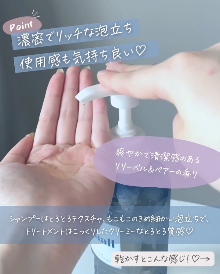 髪のダメージを補修しながら潤いを与えてくれるヘアケアライン♪ カラーリングの色落ちを防ぎ、美しい髪色をキープする効果も◎ 濃密な泡で髪全体を優しく洗えて洗い上がりはしっとり。 きしみもなくやさしくなめらかな使い心地です。 リリーベル&ペアーの軽やかなフローラル系の香り。 甘すぎず爽やかでとても心地良く洗えます。
