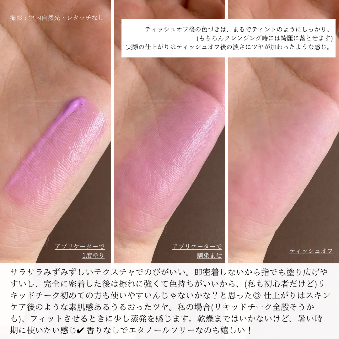 程よい水分感があり肌にスーッと溶け込んでいきます 液がゆるすぎないので、定着力もしっかりあってベースメイクも剥がれにくいです◎ くすみのないミルキーなラベンダーピンク🪻🤍 結構青みが強そうな色だなと思っていましたが、ピンクが入っているので、肌にのせると思ったより馴染みます◎ 水彩画のような透き通った発色で、じゅんわりした自然な血色感を与えてくれます🎨