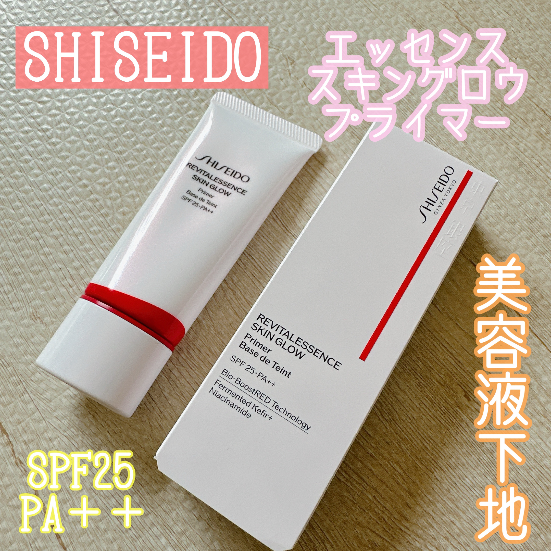 - 2)SHISEIDOエッセンス スキングロウ プライマー エッセンス スキングロウ シリーズから美容液下地、登場。 化粧下地から美容液レベルの新体験。美肌に導くファンデーションと同じ美容成分、ナイアシンアミド*1・ケフィア発酵エキスGL*2を配合。つけた瞬間からうるおいを角質層まで届け、自然なカバー効果とつややかな仕上がりが続きます。 *1 うるおい保護成分 *2 保湿成分:乳酸桿菌/コメ発酵物、グリセリン