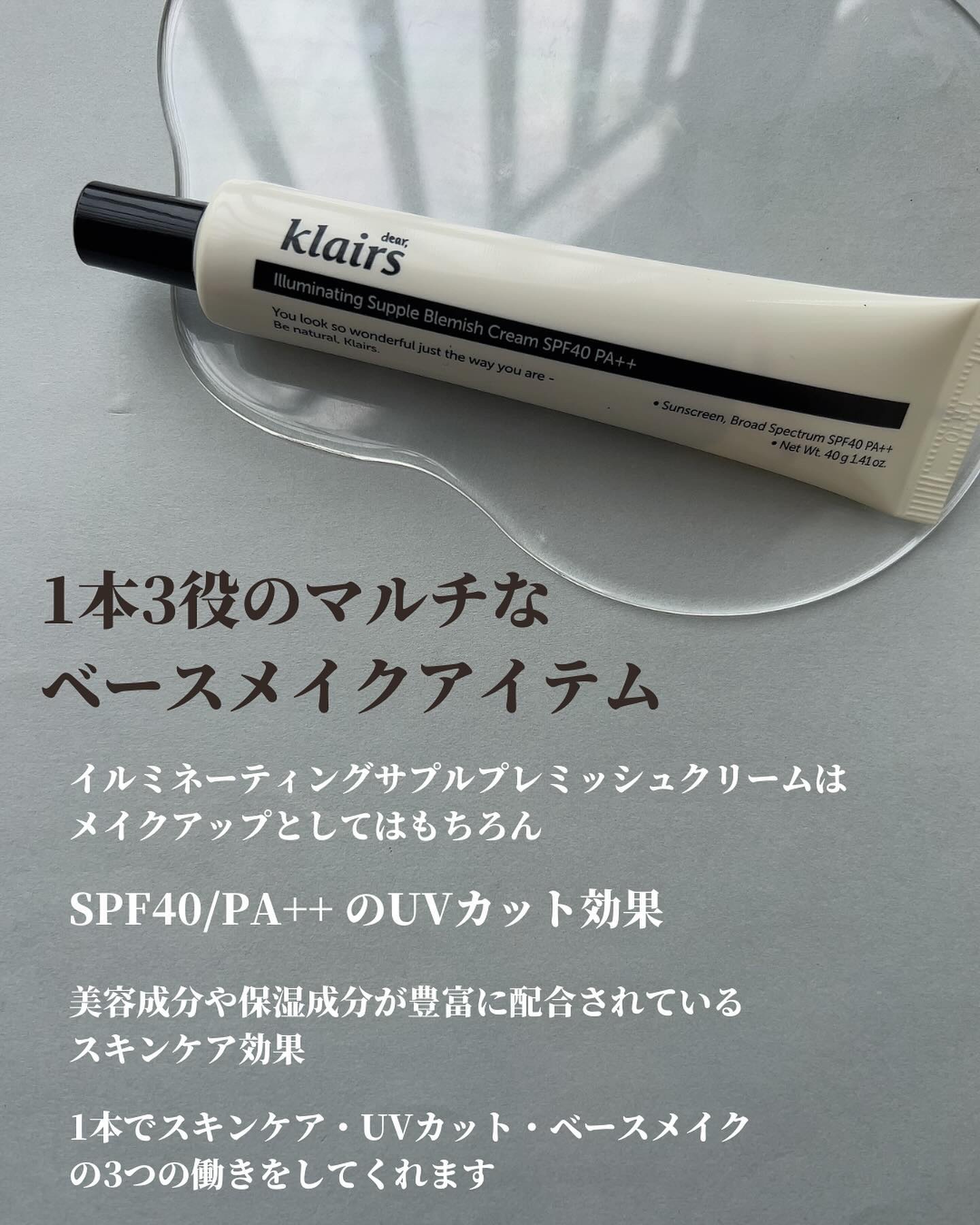 クレアスイルミネーティングサプルブレッシュクリーム¥2,600@klairs.jp様からプレゼントいただきました🎁1本で完成する3in1のハイブリッドBBクリームで、UVカット(SPF40PA++)はもちろん、メイクまでできるクリームです✨本...