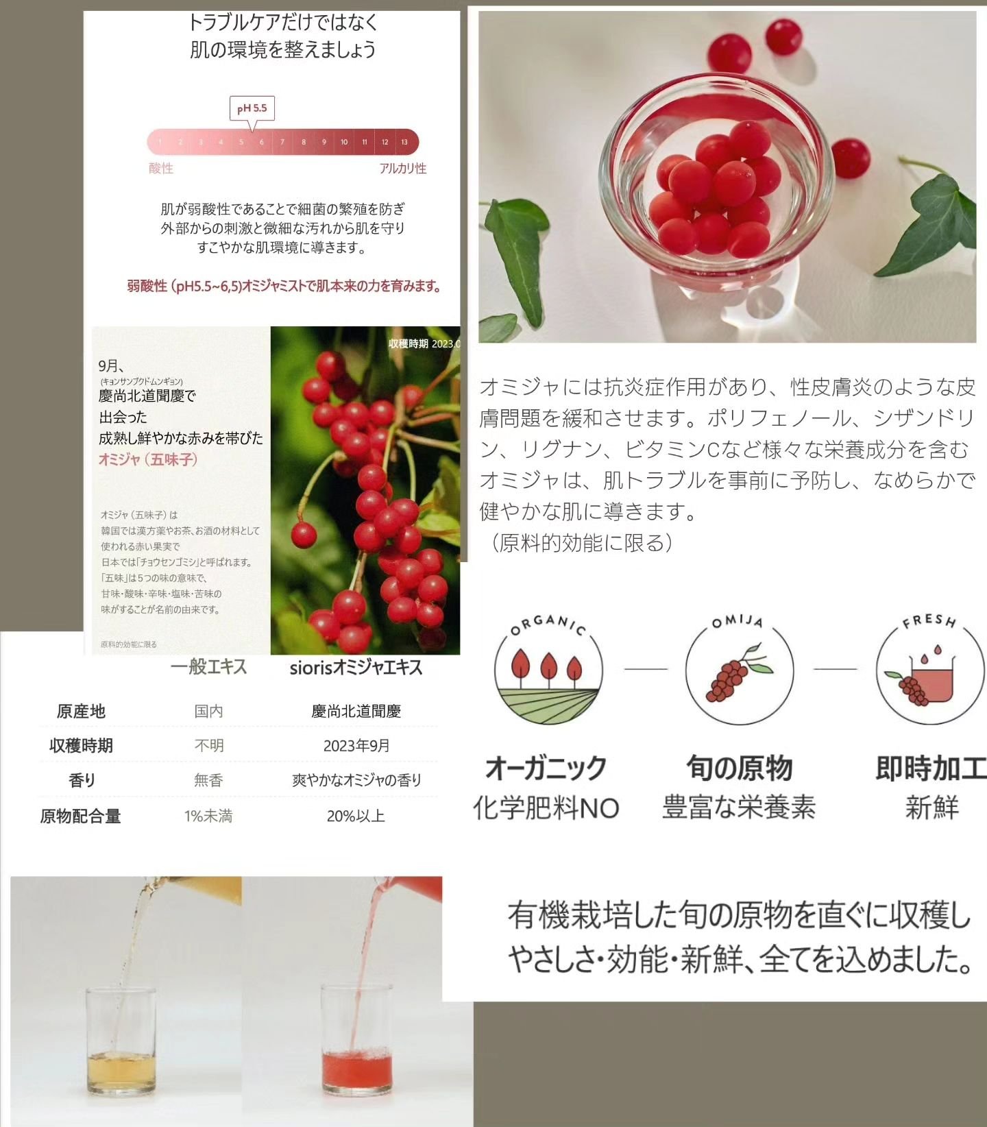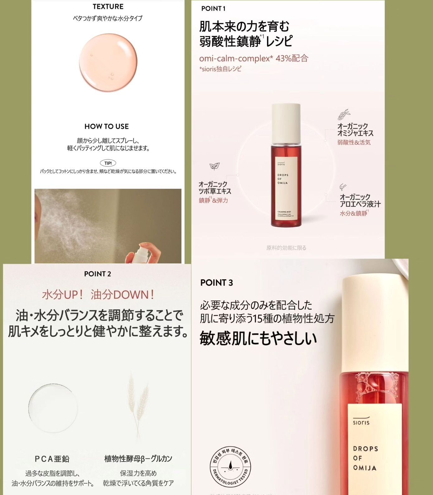 肌本来の力を育む弱酸性沈静レシピ ・オミジャ=弱酸性&活気 ・ツボ草エキス=沈静&弾力 ・アロエベラ液汁=水分&沈静 オミジャとは 漢方などに使われる果実で鎮静、水分と油分バランスを整え、肌のpHを弱酸性に保ってくれるなどの効果があるそうです。 細かい霧状のミストでベタつきはなくさっぱりとした使用感 時間があるときはコットンパックとしても使ってます。