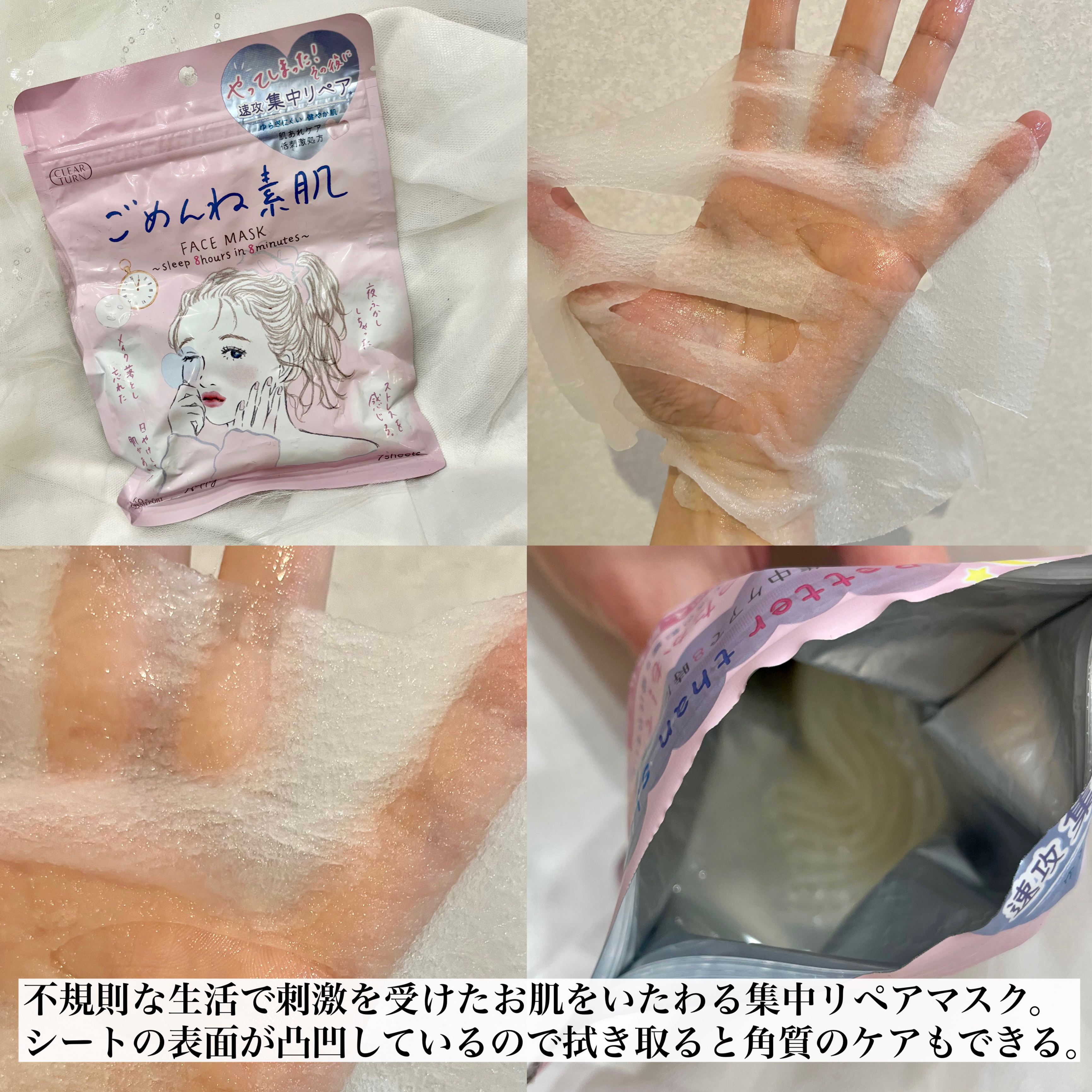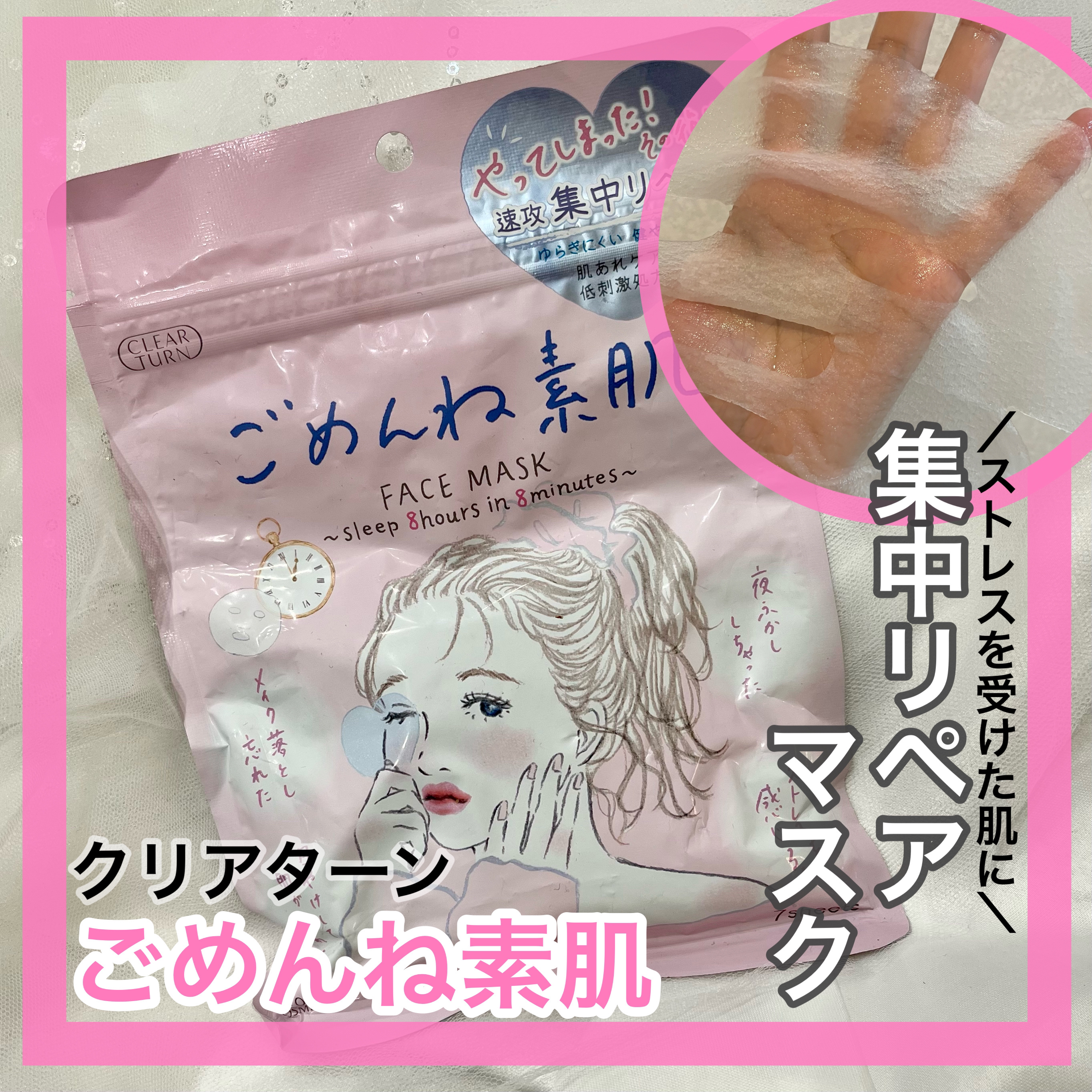 - 【クリアターン ごめんね素肌マスク】 負担をかけて、あれてしまった肌の素肌環境※1をととのえる“速攻集中リペア※2マスク”です。 ① あれがちな肌を素早くコンディションケア! ザクロエキス、桜エキス※3、ウメ果実エキスBG配合し、ゆらぎやすい肌環境をととのえ、肌あれをケアします。また、うるおいケア成分として、ヒアルロン酸、白キクラゲ多糖体BGを配合。外的ストレス※4や不規則な生活の影響を受けやすい肌も健やかでゆらぎにくい肌へみちびきます。 ②敏感肌も使える、弱酸性・低刺激処方 無香料・無着色・無鉱物油・アルコールフリー(エチルアルコール)・パラベンフリー・紫外線吸収剤フリー・シリコーンフリー・パッチテスト済み・アレルギーテスト済み・スティンギングテスト済み・敏感肌自覚者による連用テスト済み(すべての方にアレルギーや皮膚刺激が起きない、刺激感がないというわけではありません。すべての方の肌に合うということではありません。) ③角質ケアもできる!凸凹高密着シート コットン生まれのやわらかな肌触りのベンリーゼを使用。 表面に凸凹のエンボス加工を施しているため、密着性が高く、はがしたマスクでやさしく顔をふきとることで角質ケアもできます。 ※1 うるおい環境のこと ※2 うるおいお手入れのこと ※3 ソメイヨシノ葉エキス、ウメ果実エキスBGはウメ果実エキス・BG(保湿) ※4 乾燥による刺激のこと